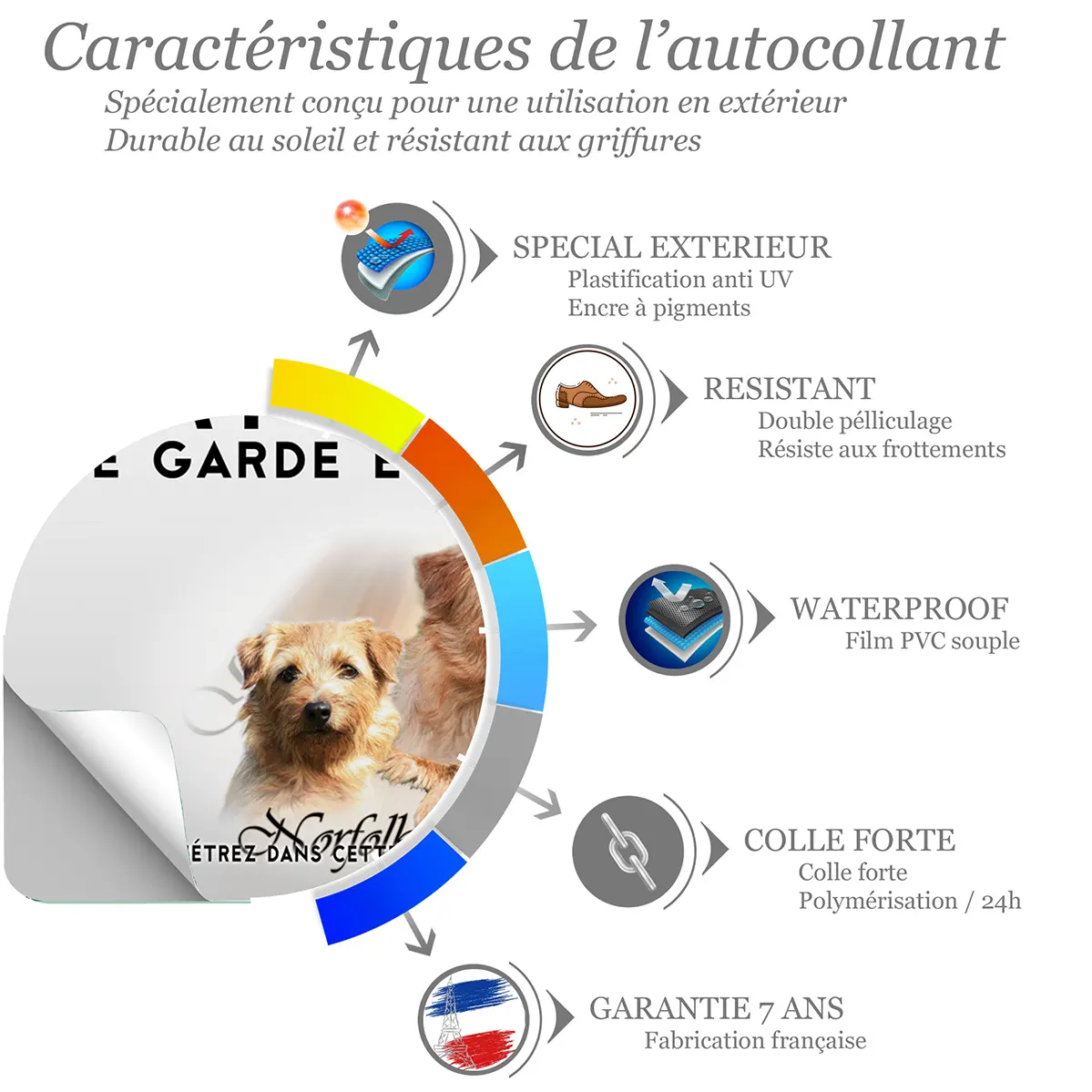 Le terrier de Norfolk, avec son caractère intrépide et loyal, représente un allié précieux pour toute famille. Originaires des terres d’Angleterre, ces chiens sont réputés pour leur vigilance naturelle et leur instinct de garde inné. Le terrier de Norfolk est bien plus qu’un simple protecteur ; c’est un compagnon affectueux qui se montre doux et chaleureux avec les siens. Il veille sur le foyer avec une attention toute particulière, équilibrant habilement son instinct de garde et sa doucœur familiale. Ce panneau attention au chien terrier de norfolk magnifie ce rôle protecteur tout en soulignant l’affection que vous portez à votre animal.
