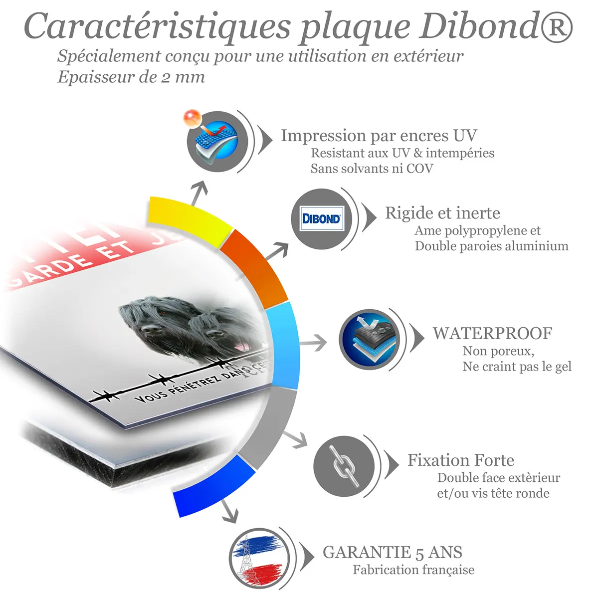 Affichez avec force et élégance la présence de votre Terrier Noir De Russie. Ce panneau Attention au Chien Terrier Noir De Russie de la Gamme Impact, disponible en métal Dibond et autocollant résistant aux intempéries et imprimé en UV, offre un contraste puissant pour une lisibilité immédiate et une dissuasion polie à l’entrée.