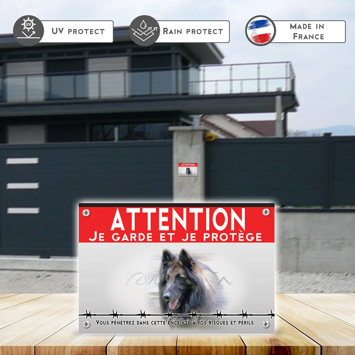Ce panneau attention au chien arbore un fond dégradé allant du blanc au gris clair, renforçant la clarté de son message. En haut, le mot « ATTENTION » se décline en rouge vif, tandis que « Je garde et je protège » s’élève en lettres blanches, véhiculant un message fort. Au centre, trois Tervuren fauves affichent des expressions amicales et alertes, ajoutant une touche chaleureuse et rassurante à la plaque. Une ligne de fil barbelé souligne la nécessité de respecter cet espace, tout en gardant un ton accueillant.
