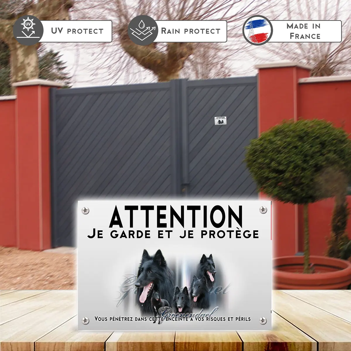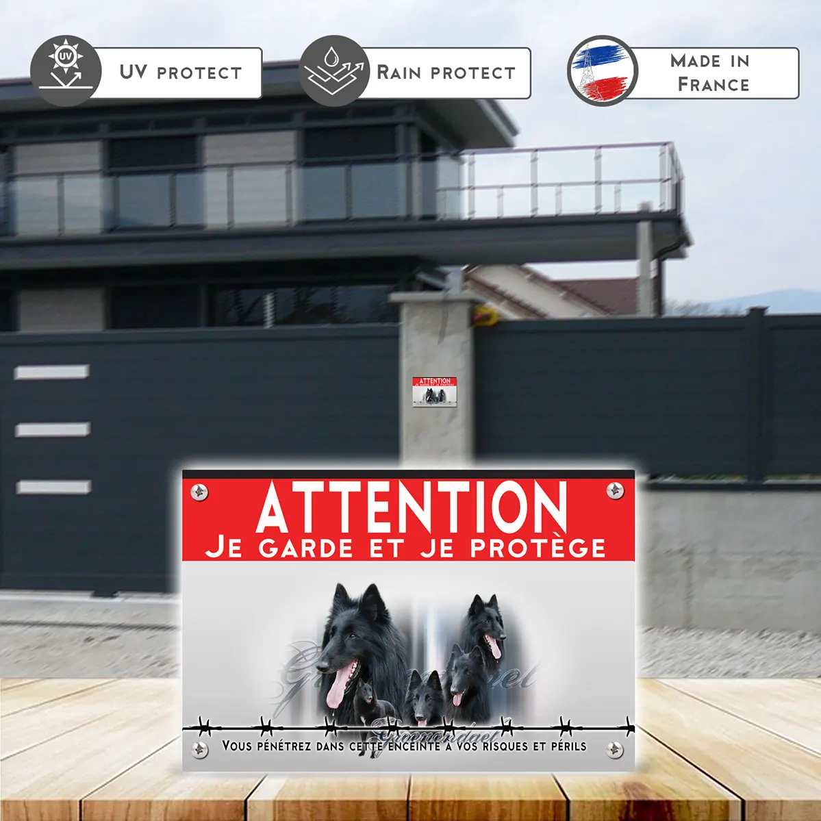 Le design de ce panneau est soigneusement pensé : un fond gris clair met en valeur des éléments sombres et vifs. En haut, le mot “ATTENTION” en lettres capitales blanches sur fond rouge attire immédiatement l’attention. La phrase “Je garde et je protège” en noir renforce le message d’avertissement. Au centre, plusieurs représentations élégantes de berger belge groenendael illustrent le caractère majestueux et dynamique de cette race. La base de la plaque, entourée de barbelés noirs, accentue la notion de protection, tout en soulignant le message essentiel : “Vous pénétrerez dans cette enceinte à vos risques et périls”.