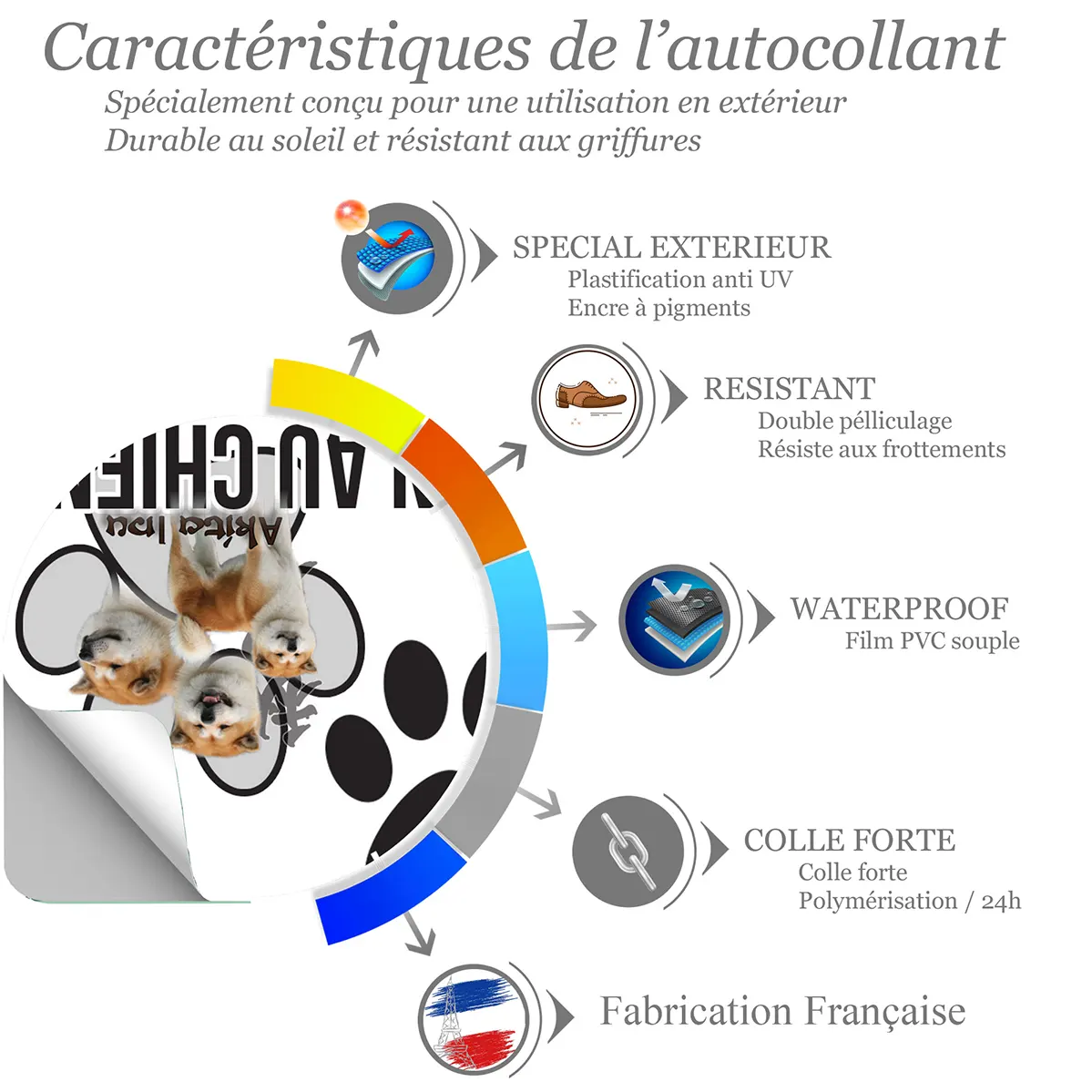 Installer une plaque Attention au chien à l’effigie de l’akita inu fauve, illustrée sous trois angles de son visage, renforce la dissuasion auprès des visiteurs ou personnes mal intentionnées. En montrant clairement la présence d’un gardien attentif, elle incite au respect de votre propriété. Grâce à son illustration réaliste et expressive, cette signalétique véhicule aussi la fierté que vous éprouvez pour votre animal.