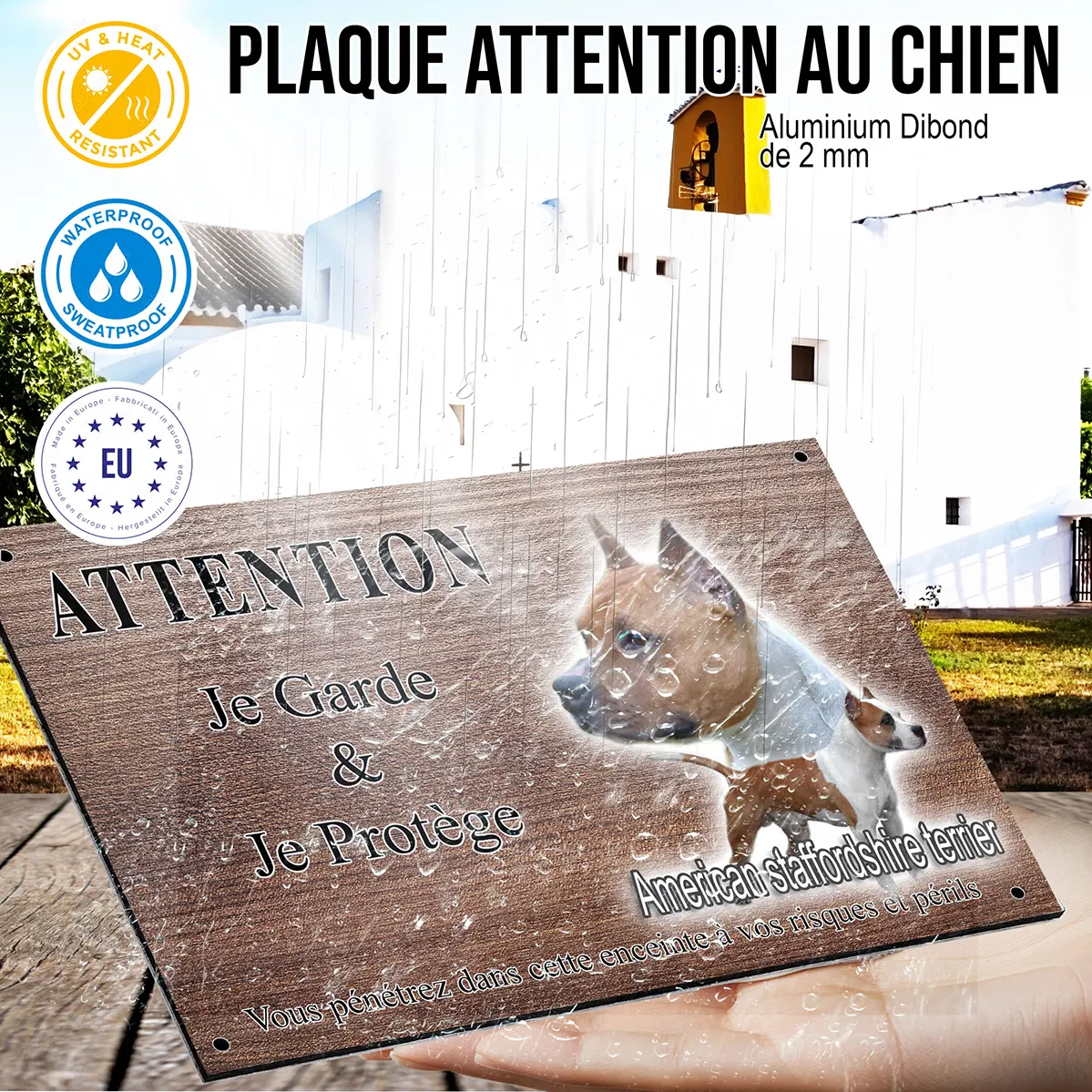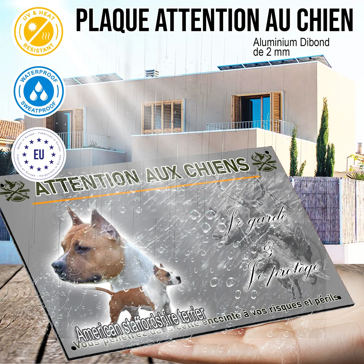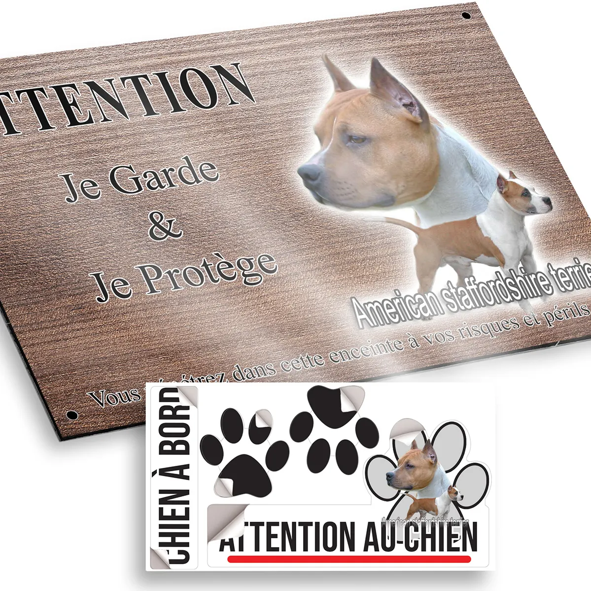 Protégez votre propriété grâce à la plaque Attention au chien amstaff à l’esthétique soignée et au message impactant. Ce modèle se distingue par une image captivante montrant un American Staffordshire Terrier en gros plan et l’autre chien en position entière, avec le texte ‘American Staffordshire Terrier’ harmonieusement intégré dans le visuel. Une signalétique indispensable pour allier dissuasion, sécurité et style.