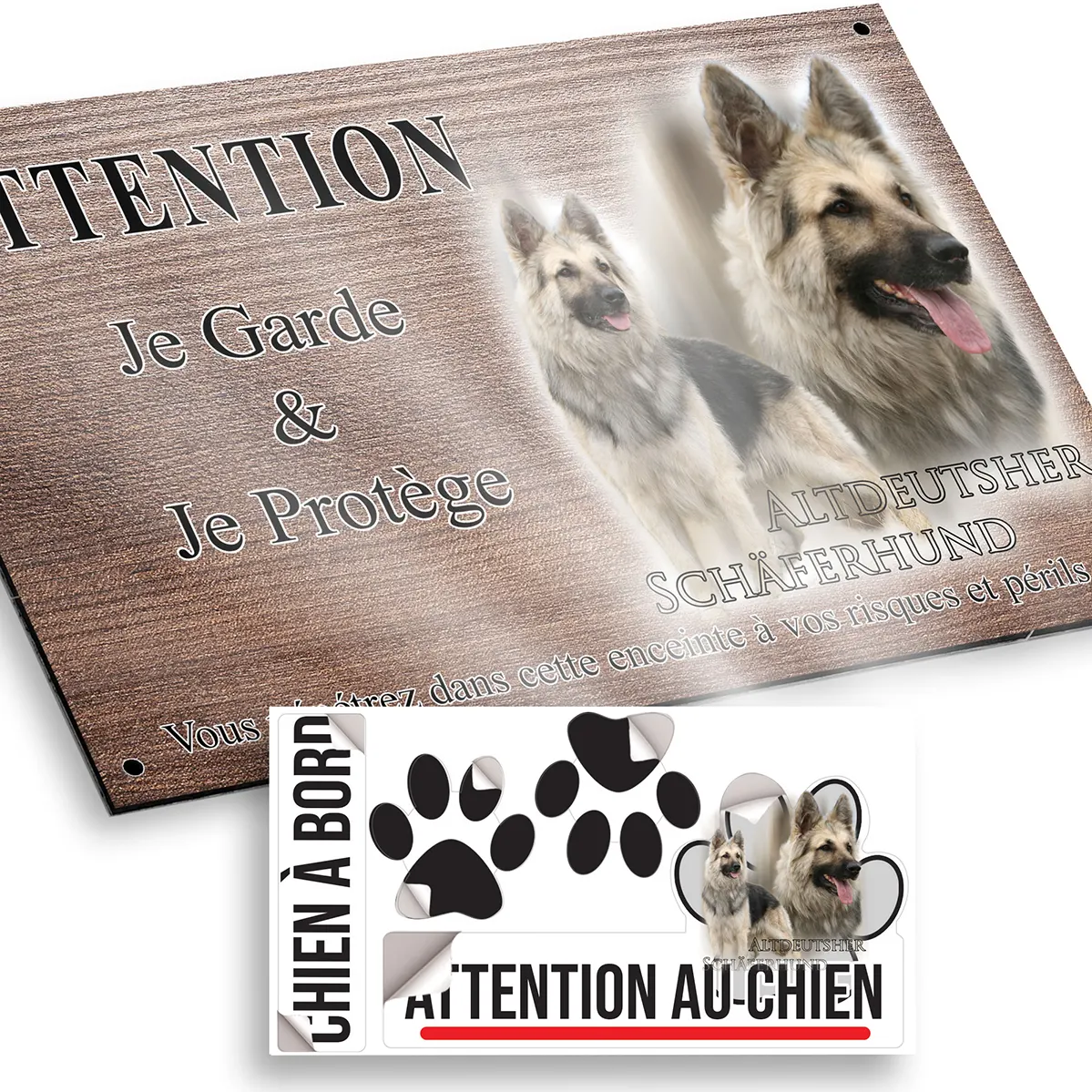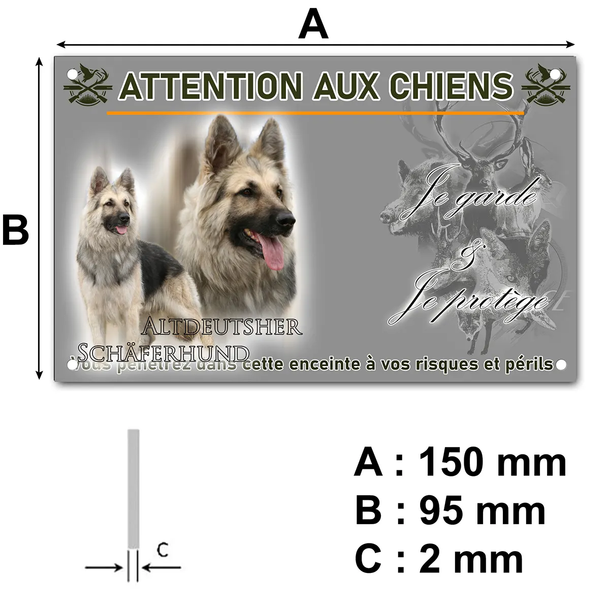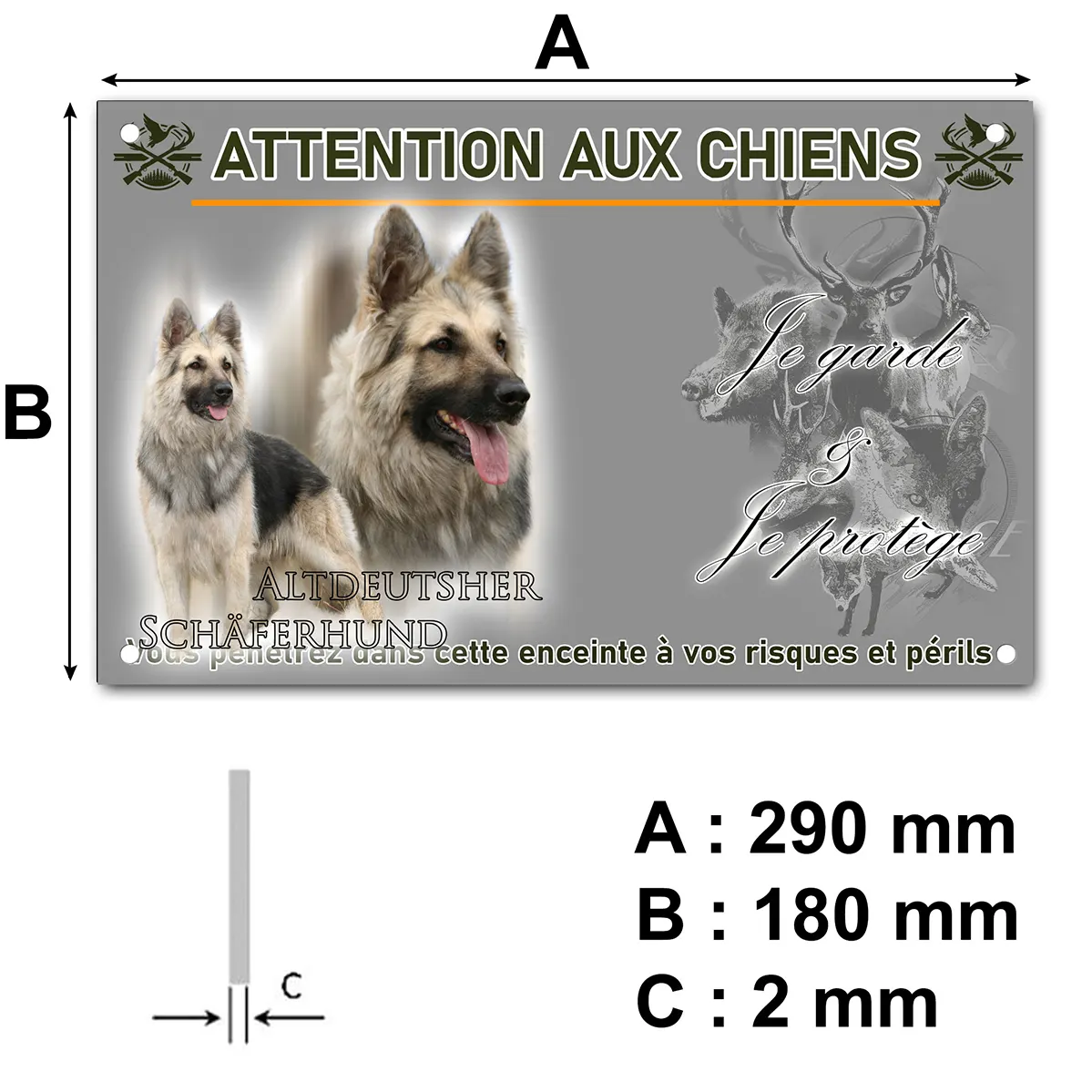 Mettez en avant la prestance et la vigilance de votre fidèle compagnon avec cette plaque Attention au chien représentant l’ancien berger allemand (Altdeutscher Schäferhund). Élégamment conçue, elle allie esthétique et signalétique efficace pour protéger votre propriété tout en témoignant de votre passion pour cette race exceptionnelle.