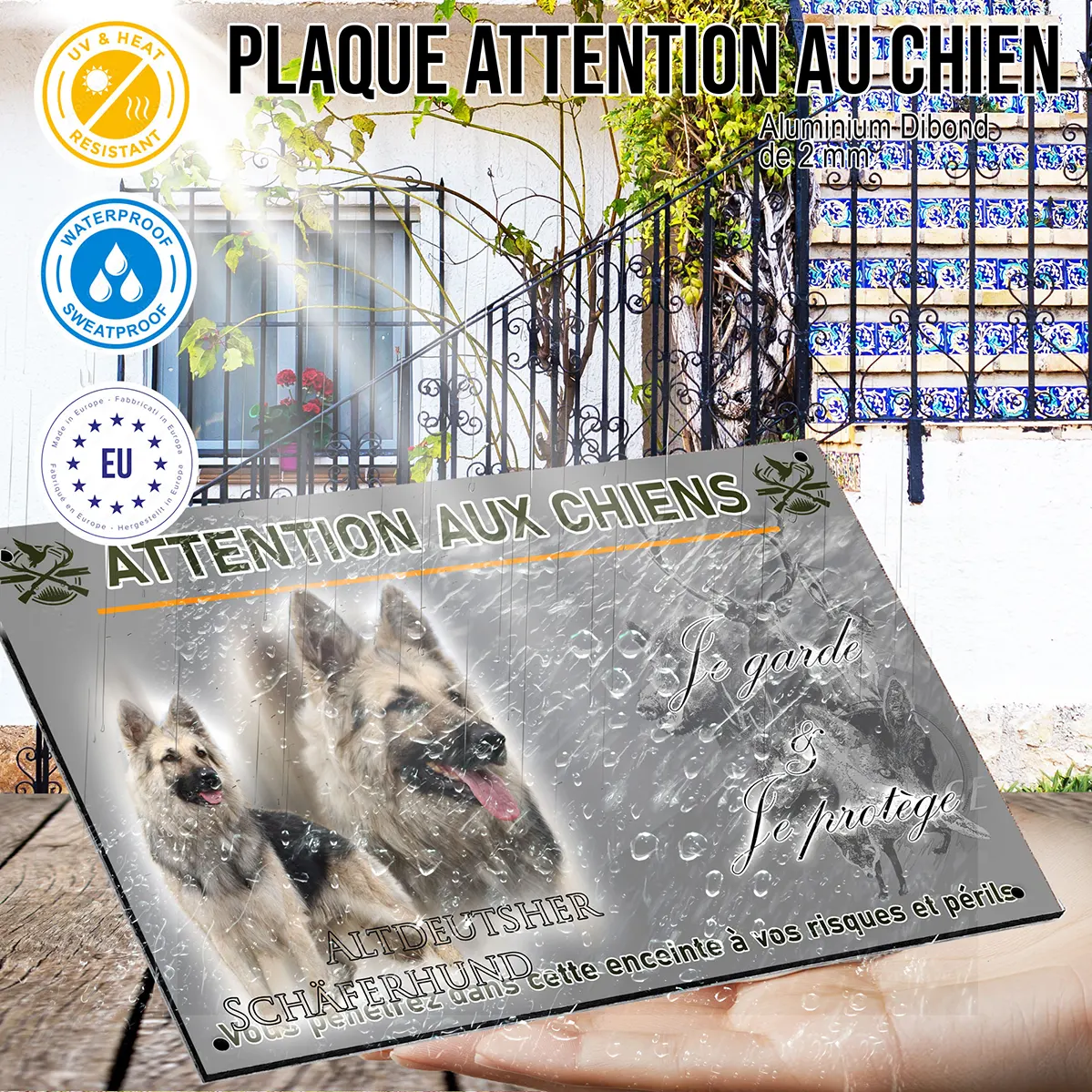 Installer une plaque Attention au chien avec l’Altdeutscher Schäferhund en vedette est une mesure de dissuasion efficace. Le regard expressif et la posture de cette race impressionnent naturellement les visiteurs et signalent une surveillance constante, réduisant ainsi les risques d’intrusion. Sa présence représentée sur la plaque met l’accent sur son instinct de gardien et sa fiabilité, tout en rassurant vos proches.
