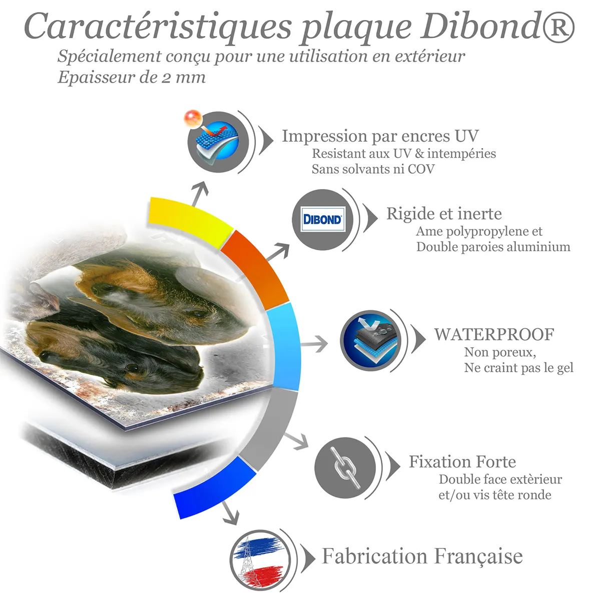 Oui, la plaque est fabriquée en aluminium Dibond de 2 mm et imprimée en UV. Elle ne craint ni la pluie, ni le soleil, ni le gel. Elle peut rester fixée dehors toute l’année sans perdre ses couleurs.