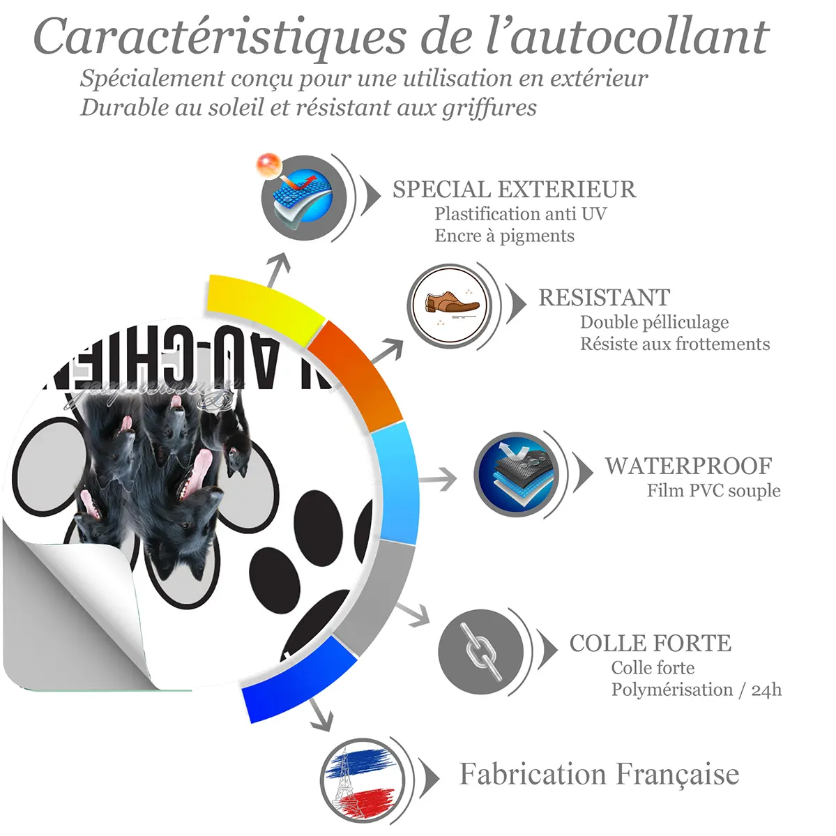 Installer une plaque Attention au chien illustrée de l’image réaliste d’un Groenendael au pelage noir, c’est valoriser l’aspect dissuasif et préventif de la signalétique. En avertissant les visiteurs et éventuels intrus de la présence d’un chien protecteur, vous renforcez la sécurité de votre propriété. Le regard intense et la stature de ce berger ne laissent pas indifférent : cette dissuasion naturelle complète parfaitement les autres moyens de protection.