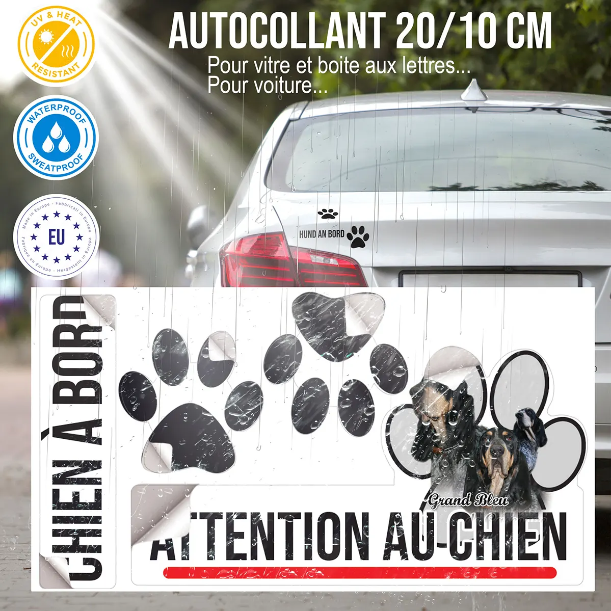 Installer une plaque Attention au chien à l’effigie du Grand Bleu de Gascogne présente de nombreux avantages. Non seulement elle prévient efficacement toute intrusion ou tentative de cambriolage grâce à la dissuasion qu’inspire cette race majestueuse, mais elle valorise également votre chien en reflétant toute sa singularité. L’illustration de trois chiens en portrait rend la signalétique encore plus percutante pour les visiteurs et passants.