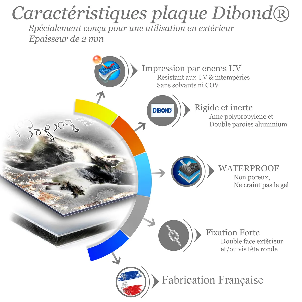 Oui, la plaque est fabriquée en aluminium Dibond de 2 mm et imprimée en UV. Elle ne craint ni la pluie, ni le soleil, ni le gel. Elle peut rester fixée dehors toute l’année sans perdre ses couleurs.