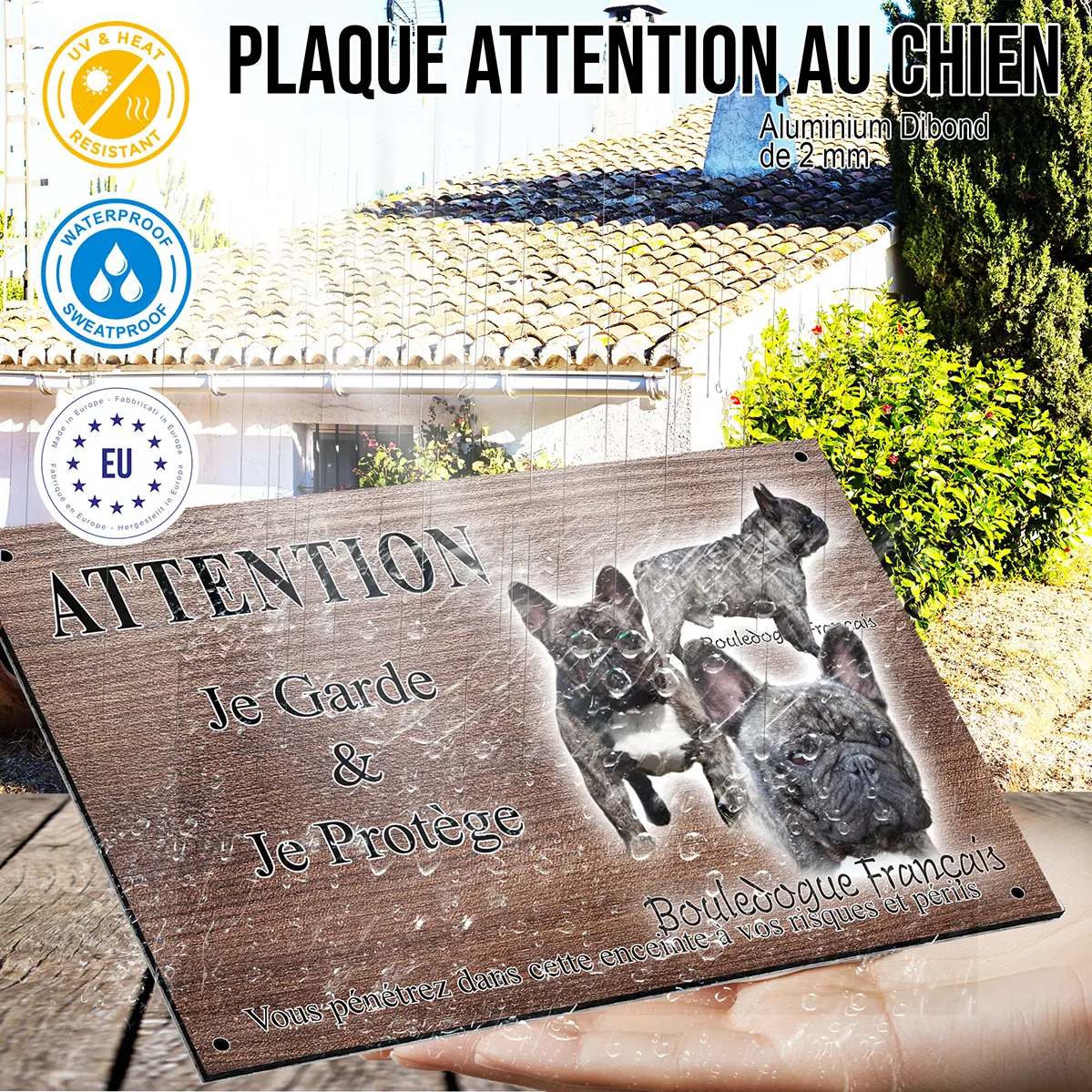 Oui, la plaque est fabriquée en aluminium Dibond de 2 mm et imprimée en UV. Elle ne craint ni la pluie, ni le soleil, ni le gel. Elle peut rester fixée dehors toute l’année sans perdre ses couleurs.