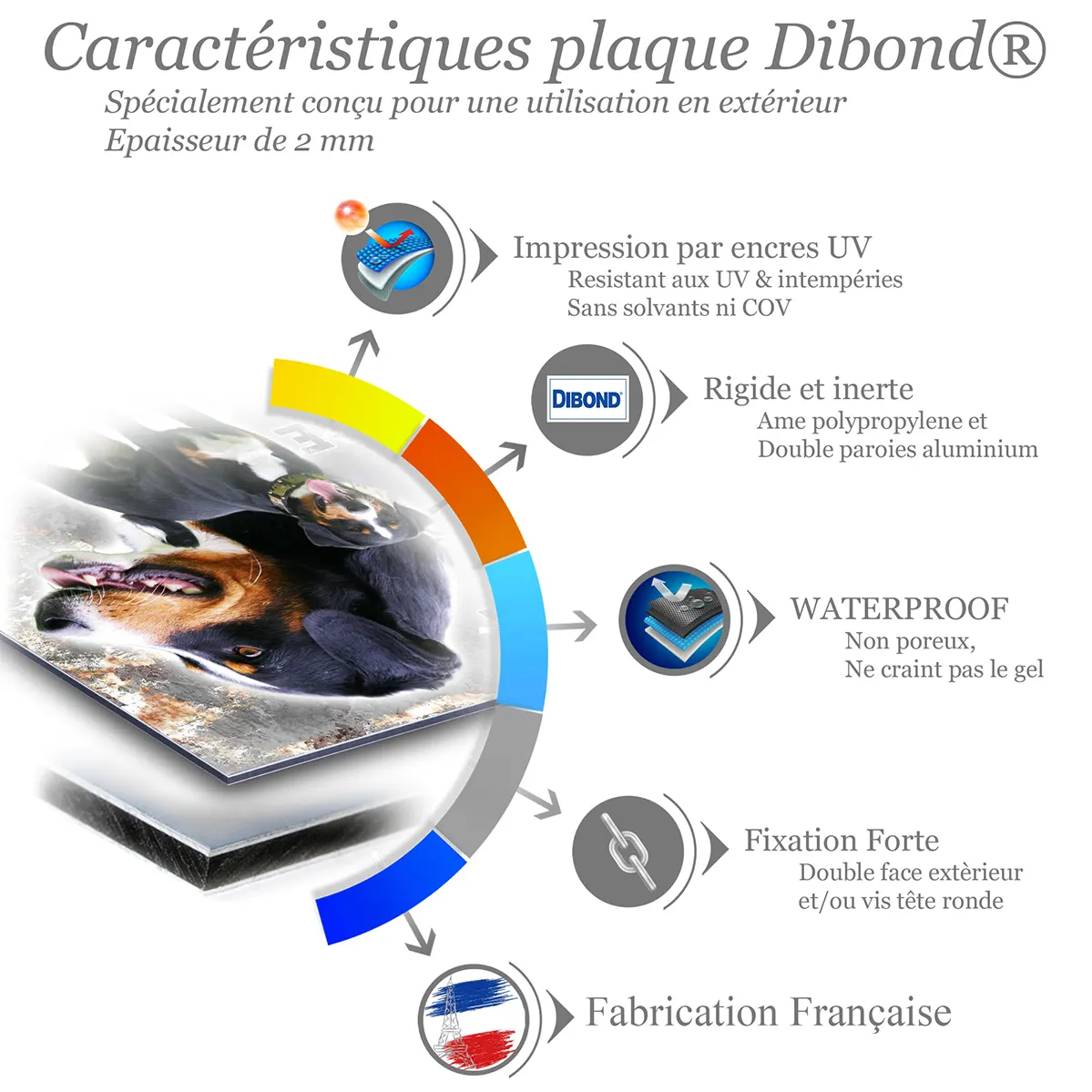 Installer une plaque Attention au chien illustrée par deux bouvier appenzell renforce la dissuasion auprès d’éventuels intrus. L’illustration détaillée, montrant à la fois un chien en gros plan et un en position debout, valorise l’aspect protecteur et accueillant de la race. Cette signalétique claire prévient vos visiteurs et livreurs tout en mettant en avant la personnalité unique de votre compagnon.