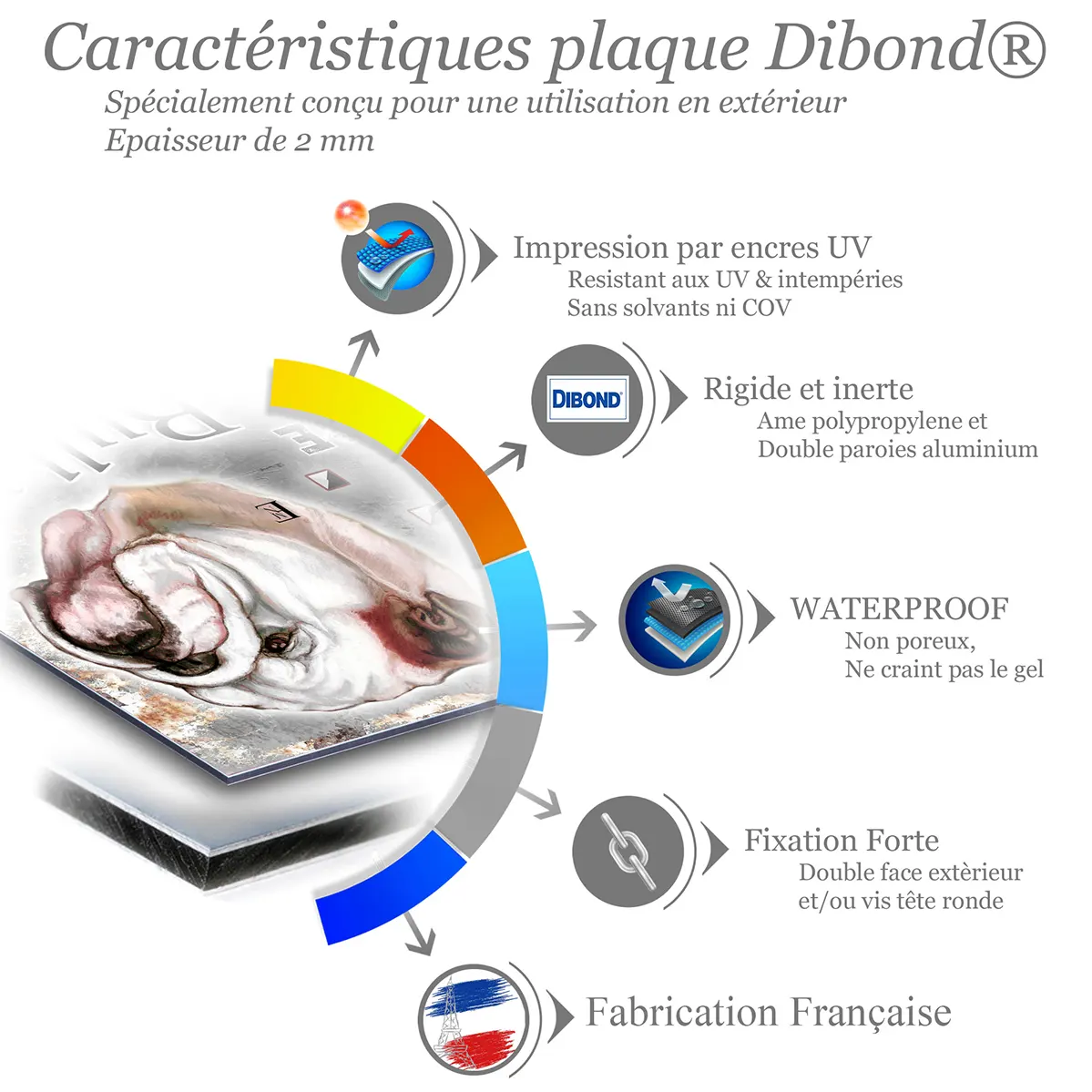 Opter pour une plaque Attention au chien bulldog, c’est avertir subtilement tout visiteur ou individu indésirable de la présence d’un chien protecteur sur votre propriété. Le portait réaliste et le nom de la race mettent en valeur les qualités de gardien propre au bulldog et renforcent la dissuasion. En un coup d’œil, la signalétique transmet un message clair tout en mettant à l’honneur le charme unique du bulldog.
