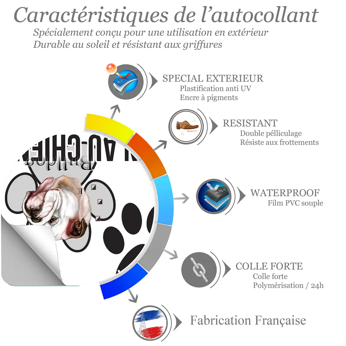 Au-delà de sa fonction de sécurité, cette plaque Attention au chien se distingue par son esthétique moderne. L’illustration personnalisée de votre compagnon à quatre pattes en fait aussi un élément de décoration original à disposer sur votre portail, porte ou clôture. Solide et résistante aux intempéries, elle assure à la fois la protection de votre foyer et une mise en valeur élégante de votre bulldog.