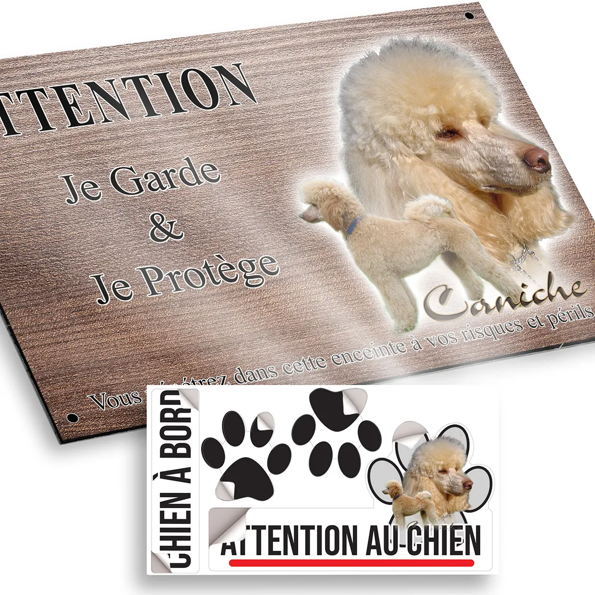 Pour en savoir plus sur notre gamme de plaque attention au chien caniche abricot
