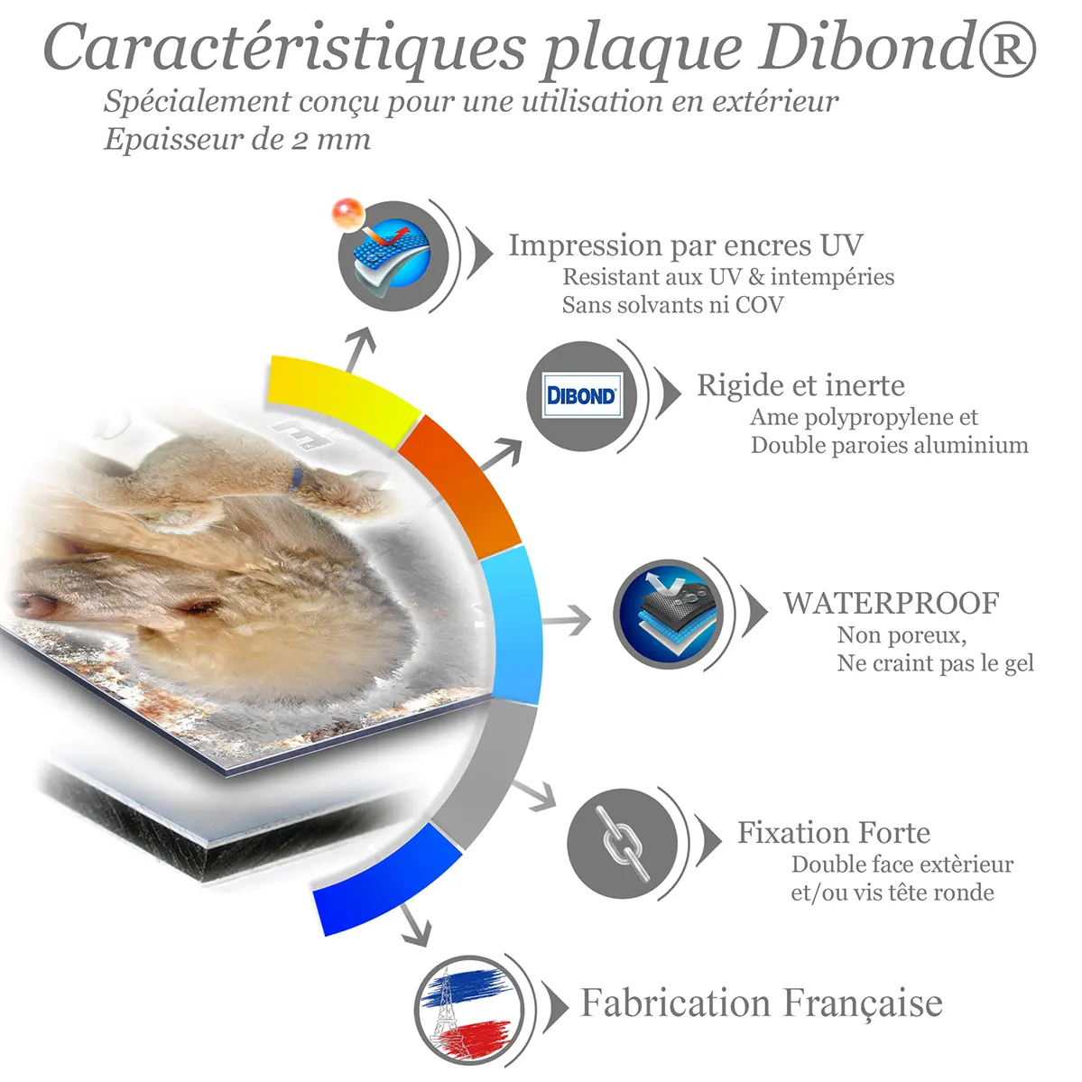 Oui, la plaque est fabriquée en aluminium Dibond de 2 mm et imprimée en UV. Elle ne craint ni la pluie, ni le soleil, ni le gel. Elle peut rester fixée dehors toute l’année sans perdre ses couleurs.