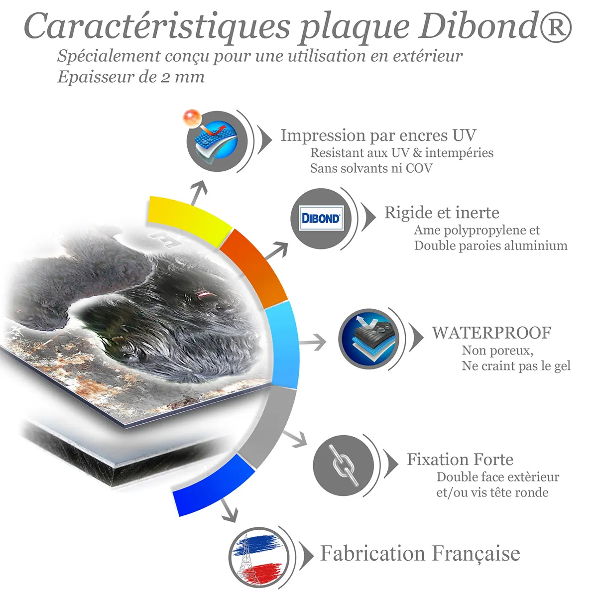 Oui, la plaque est fabriquée en aluminium Dibond de 2 mm et imprimée en UV. Elle ne craint ni la pluie, ni le soleil, ni le gel. Elle peut rester fixée dehors toute l’année sans perdre ses couleurs.