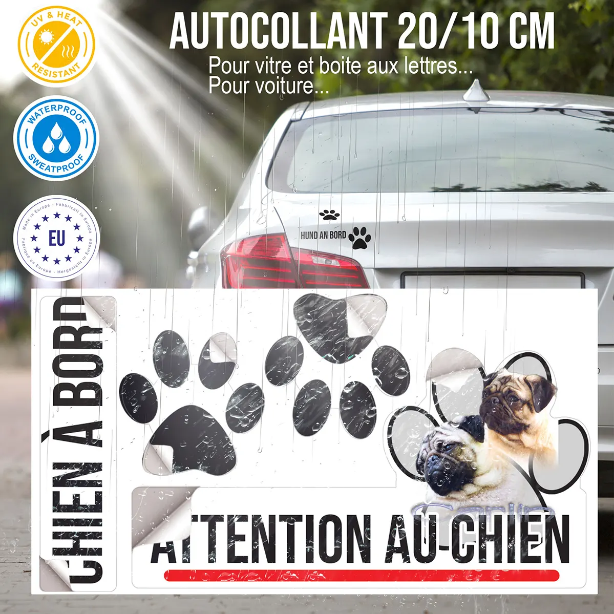 Installer une plaque Attention au chien à l’effigie de deux carlins permet de prévenir les visiteurs tout en offrant une dissuasion élégante. Même si le carlin n’est pas un chien d’attaque, sa réputation de chien de garde attentif incite à la prudence. Afficher la présence de votre animal avec une image illustrée des deux carlins aux expressions différentes renforce l’efficacité de la signalétique tout en reflétant la diversité de leur personnalité.