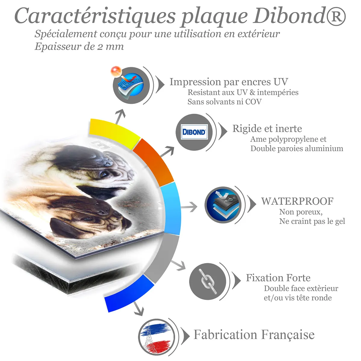 Oui, la plaque est fabriquée en aluminium Dibond de 2 mm et imprimée en UV. Elle ne craint ni la pluie, ni le soleil, ni le gel. Elle peut rester fixée dehors toute l’année sans perdre ses couleurs.