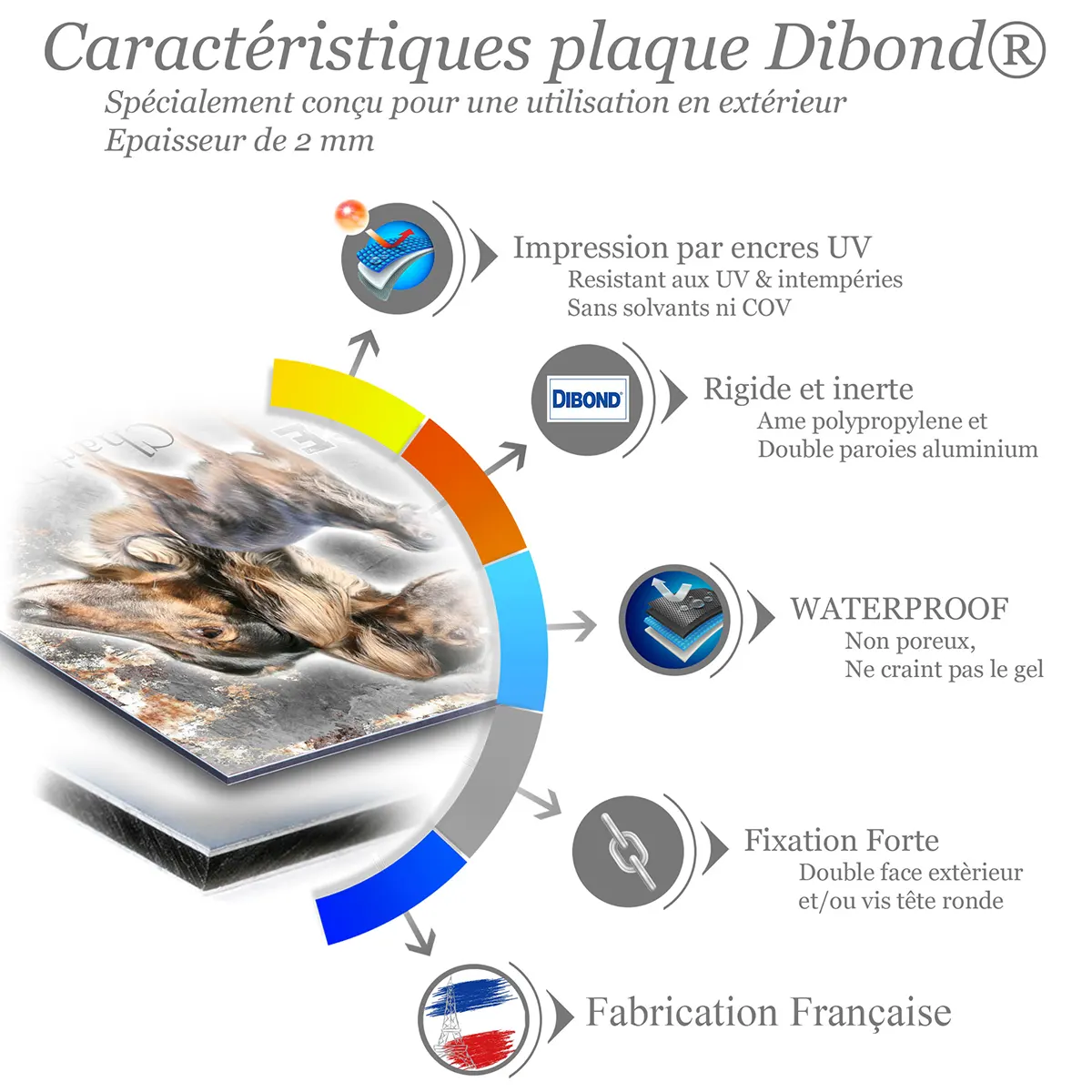 Oui, la plaque est fabriquée en aluminium Dibond de 2 mm et imprimée en UV. Elle ne craint ni la pluie, ni le soleil, ni le gel. Elle peut rester fixée dehors toute l’année sans perdre ses couleurs.