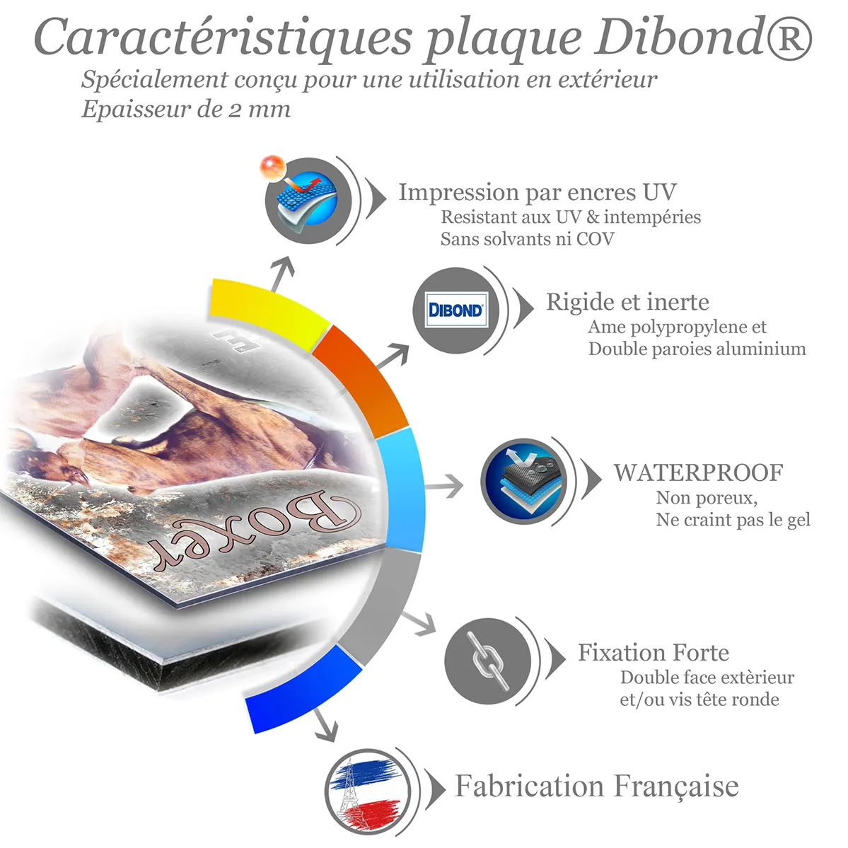 Oui, la plaque est fabriquée en aluminium Dibond de 2 mm et imprimée en UV. Elle ne craint ni la pluie, ni le soleil, ni le gel. Elle peut rester fixée dehors toute l’année sans perdre ses couleurs.