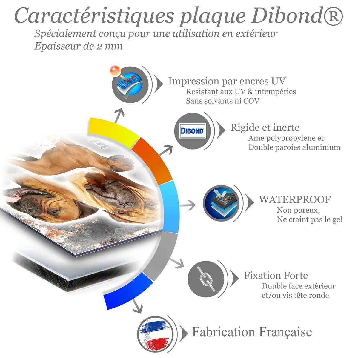 Oui, la plaque est fabriquée en aluminium Dibond de 2 mm et imprimée en UV. Elle ne craint ni la pluie, ni le soleil, ni le gel. Elle peut rester fixée dehors toute l’année sans perdre ses couleurs.