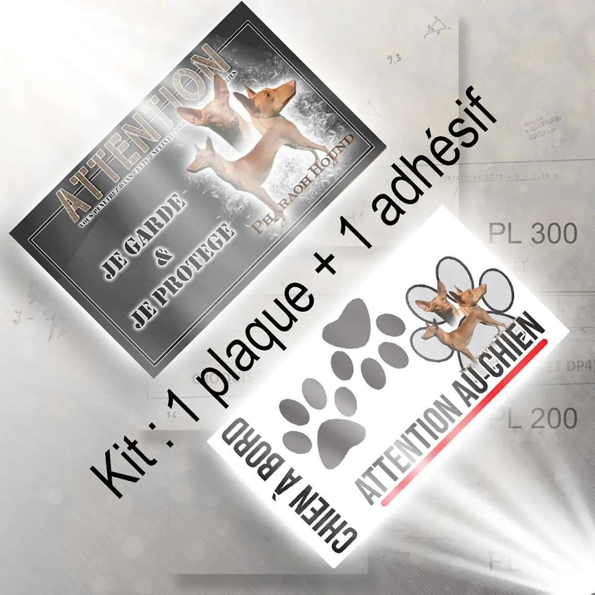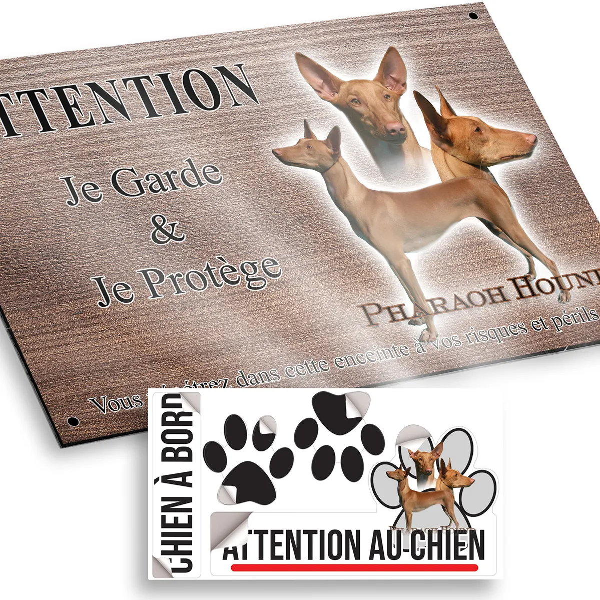 Mettez en avant la présence et l’élégance de votre fidèle compagnon grâce à notre plaque Attention au chien chien du pharaon. Conçue pour allier sécurité, esthétisme et authenticité, cette signalétique unique est ornée d’une superbe illustration : le Pharaoh Hound, ou chien du pharaon, y est présenté sous plusieurs angles, valorisant sa silhouette élancée, son port aristocratique et son visage expressif. Le fond transparent sublime la prestance naturelle du chien, tandis que le texte ‘Pharaoh Hound’ est inscrit en style cursif, ajoutant une touche élégante et originale.