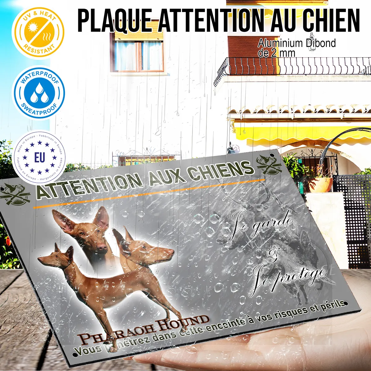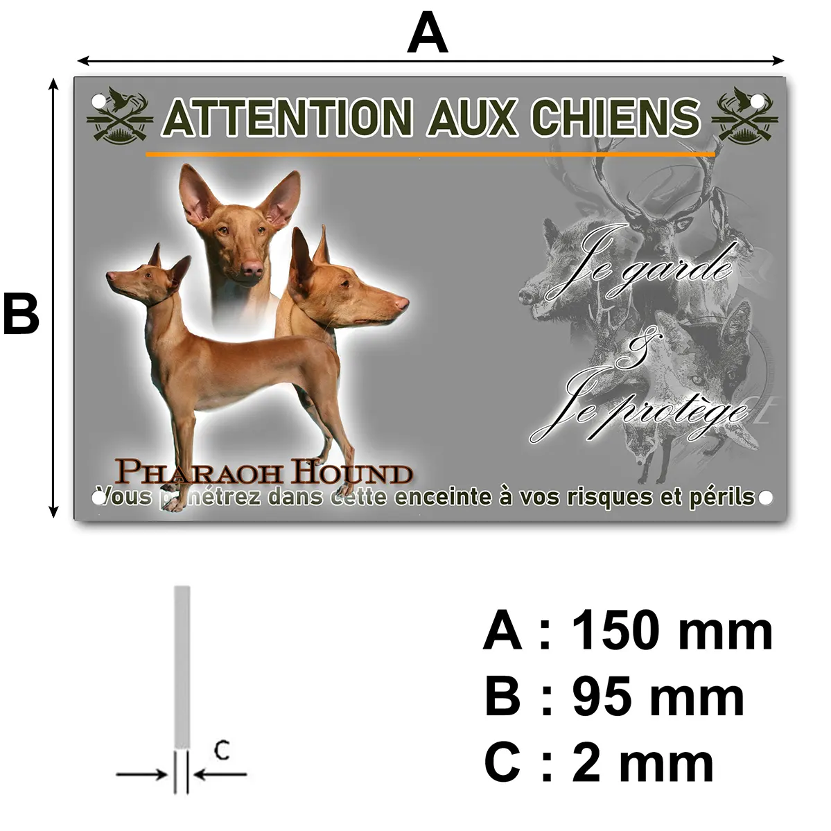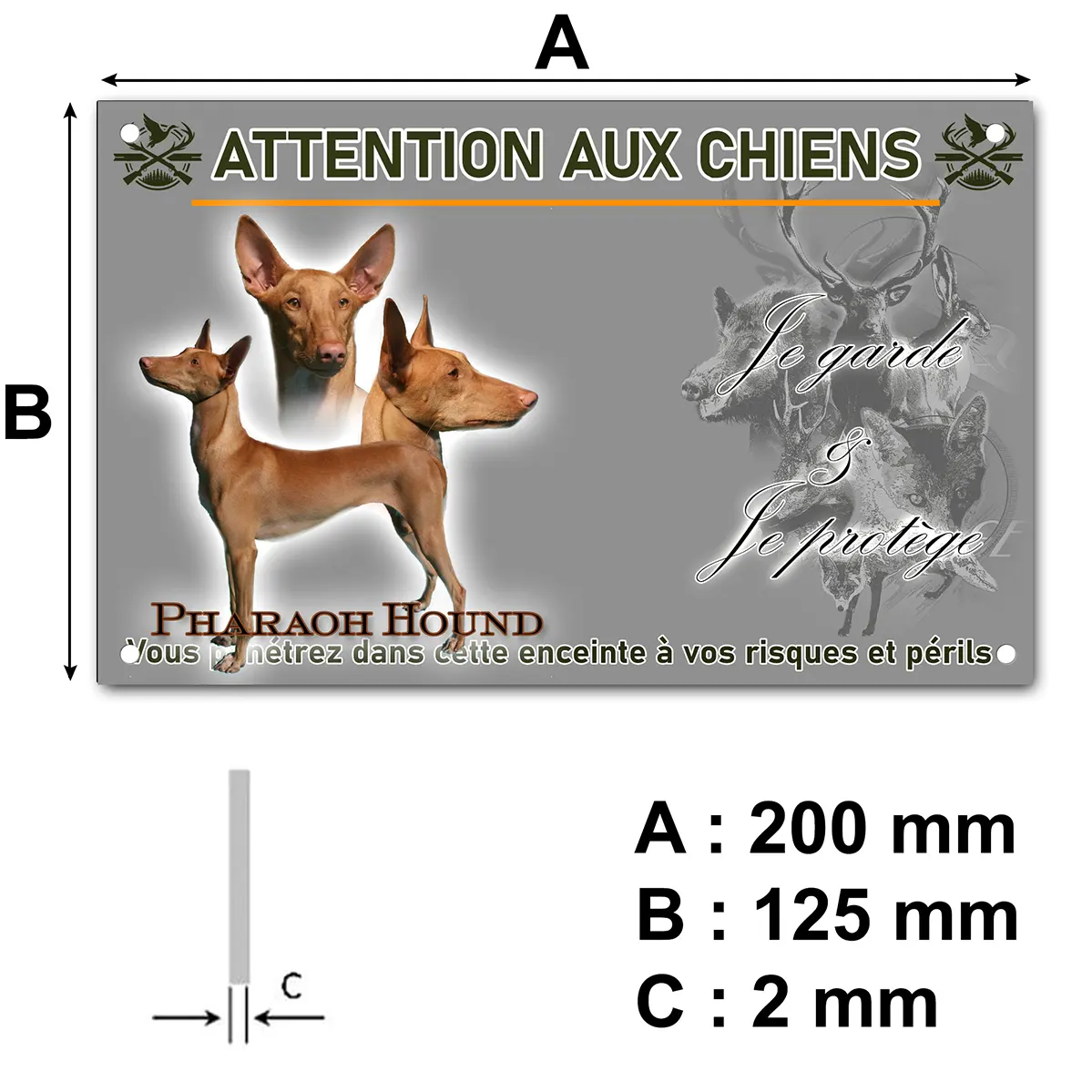 Installer une plaque Attention au chien illustrée avec l’image fidèle du Pharaoh Hound est une initiative judicieuse pour renforcer la dissuasion autour de votre domicile. Grâce à la représentation réaliste du chien du pharaon en différentes poses, les visiteurs sont avertis de la présence d’un gardien à la fois élégant et vigilant. Cette signalétique personnalisée invite au respect, tout en mettant en valeur la noblesse de votre chien.