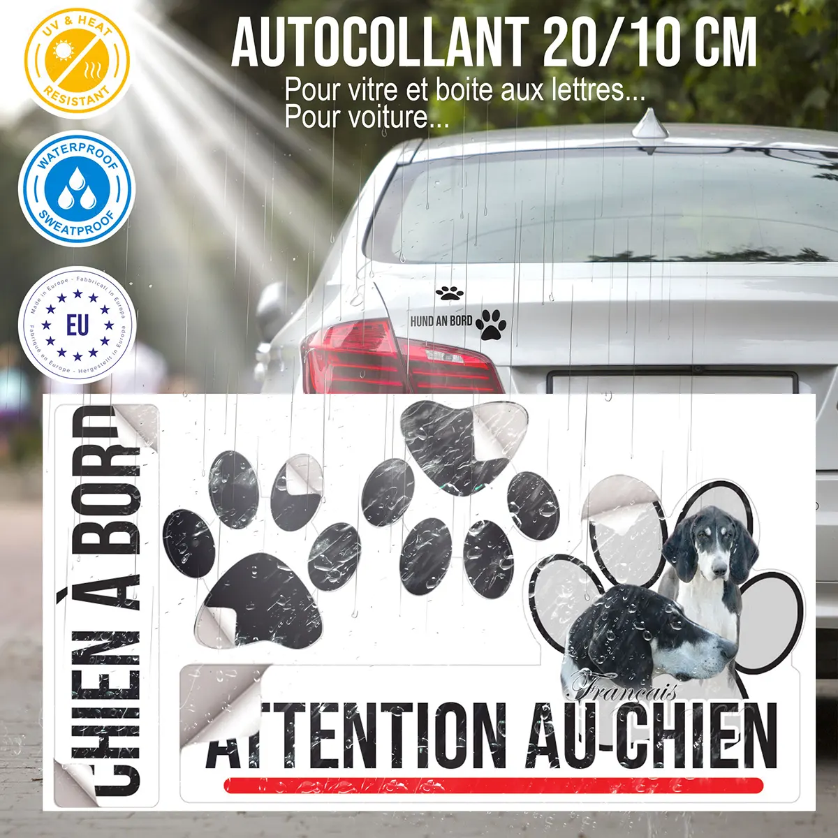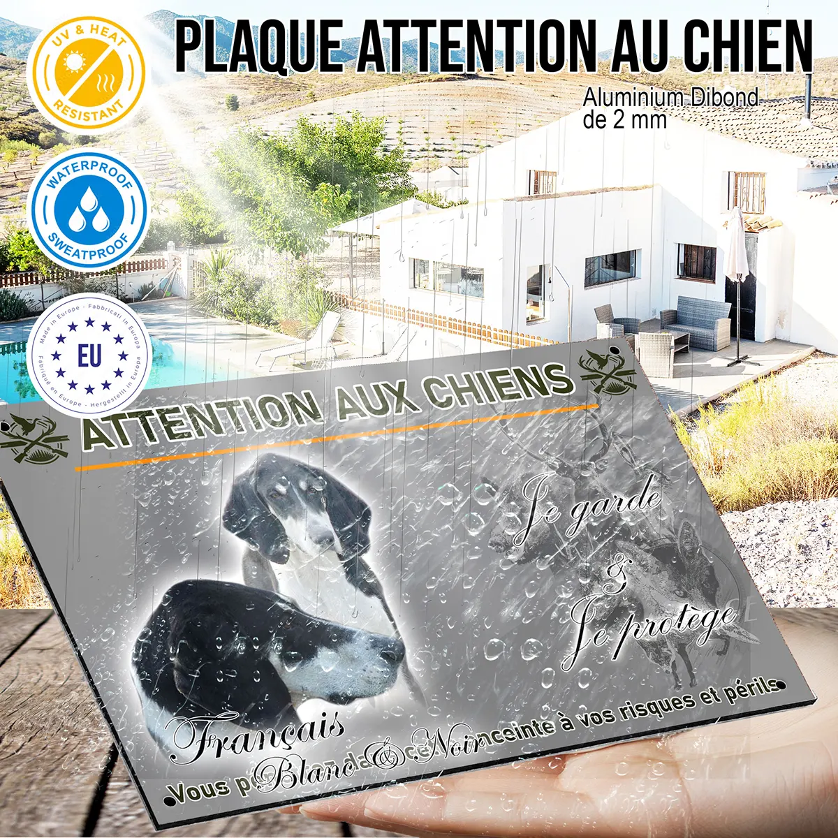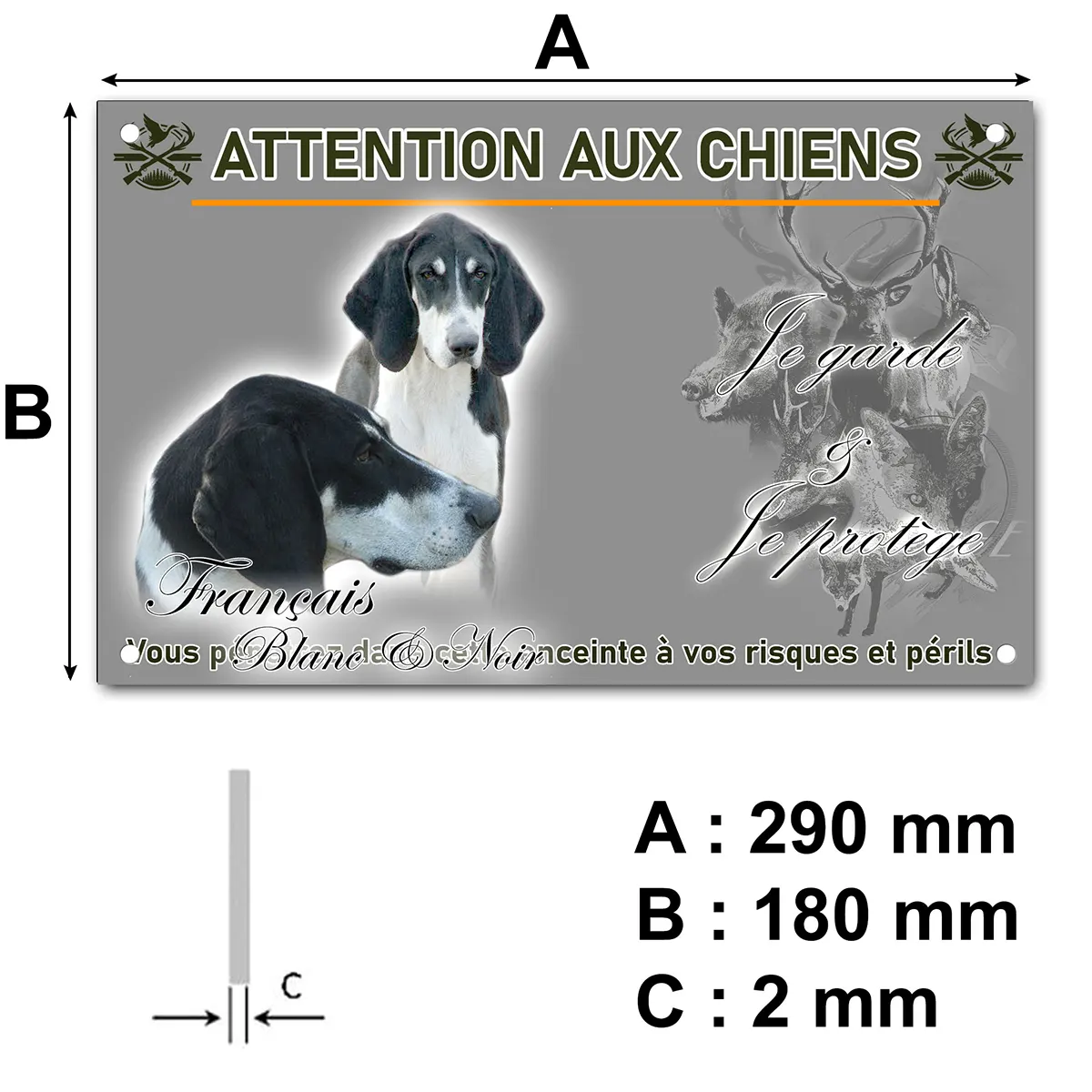 Oui, la mention “Attention au chien” est claire et lisible. Le visuel du Pointer Anglais renforce l’effet dissuasif auprès des visiteurs ou des intrus.