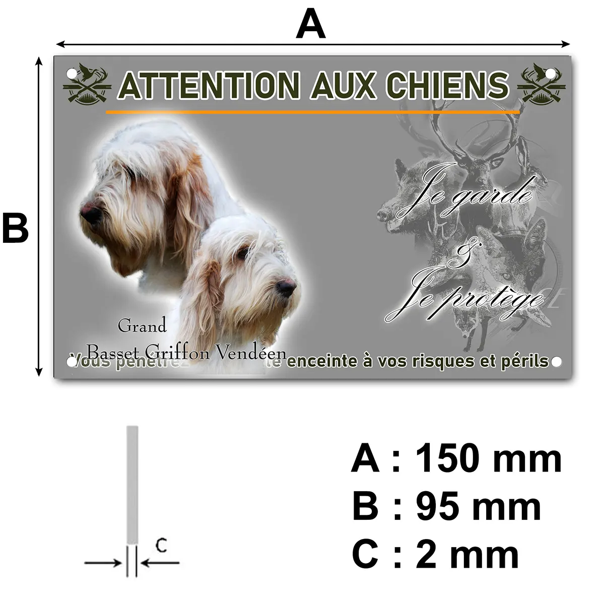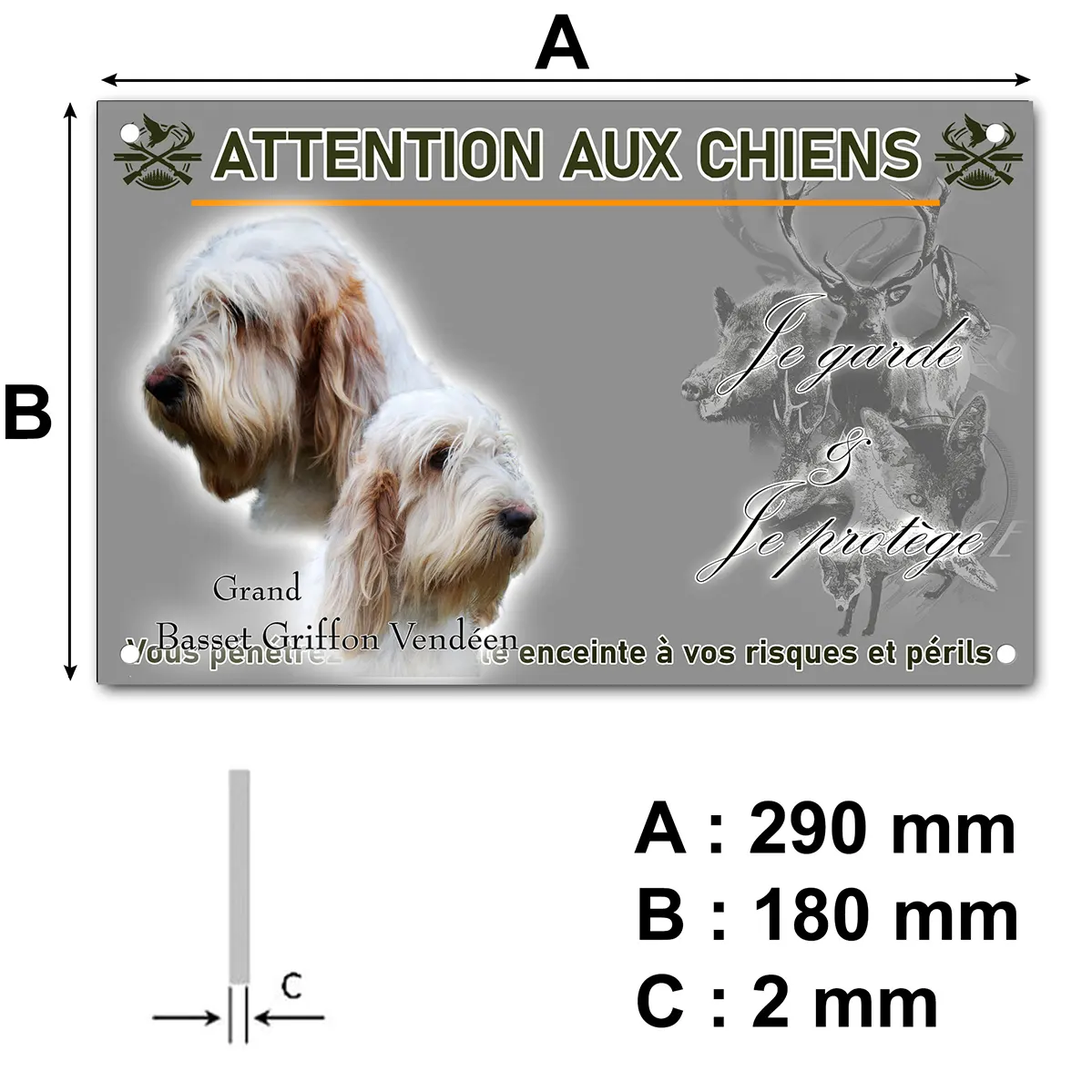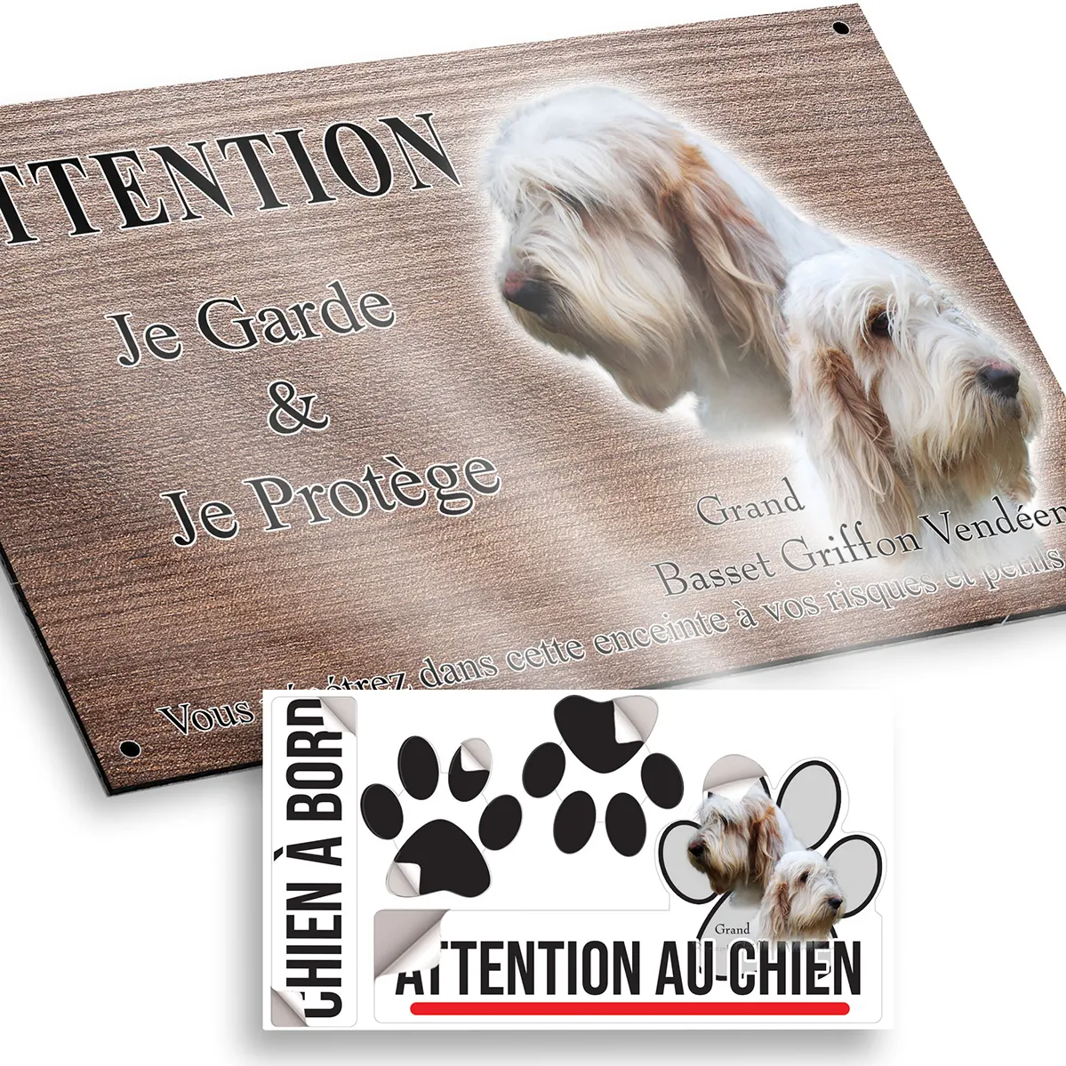 Mettez en valeur la surveillance naturelle de votre animal et protégez efficacement votre propriété grâce à la plaque Attention au chien chien grand basset. Ce panneau au design exclusif met en avant l’image de deux magnifiques Grand Basset Griffon Vendéen, capturés en gros plan, sur fond transparent. Leurs têtes arborent une robe soyeuse et une expression empreinte de douceur, reflétant à merveille le tempérament de cette race exceptionnelle.
