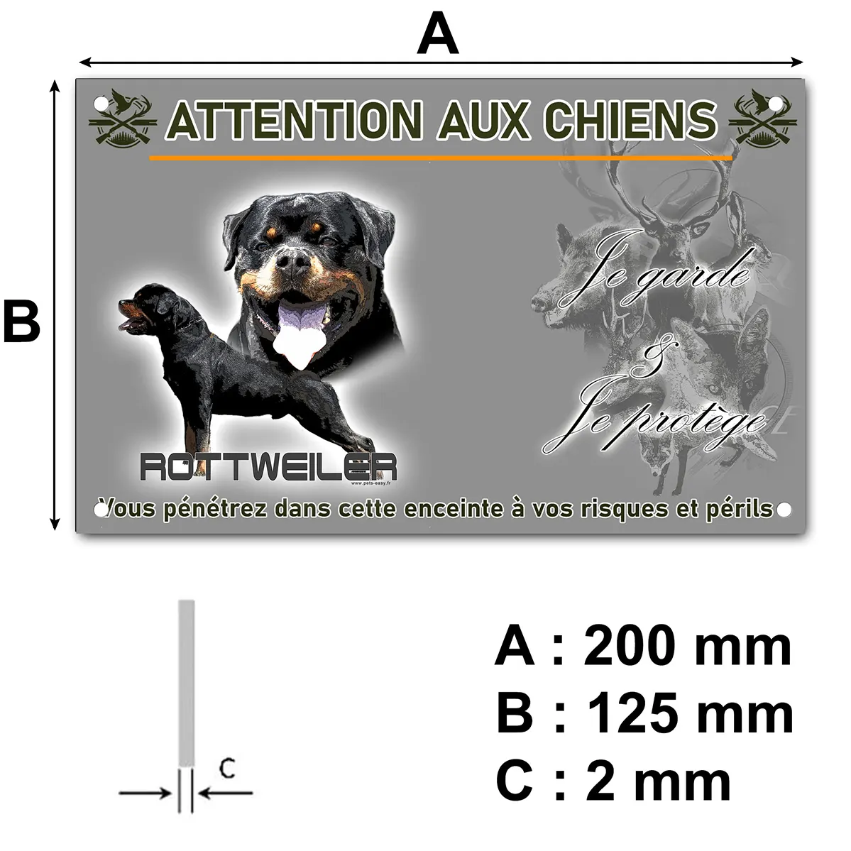 Trois tailles sont proposées (150×90 mm, 200×125 mm, 290×180 mm). Cela permet d’adapter la plaque selon l’endroit où vous souhaitez la poser (portail, barrière, porte d’entrée…).