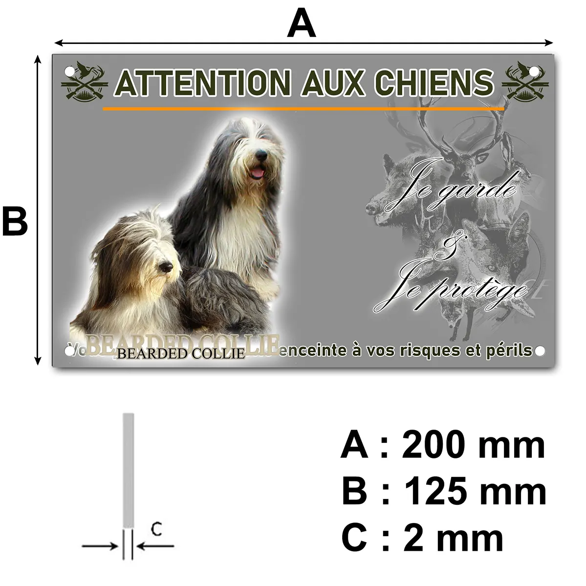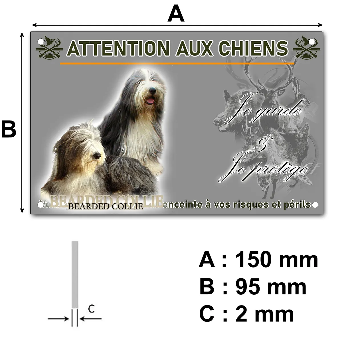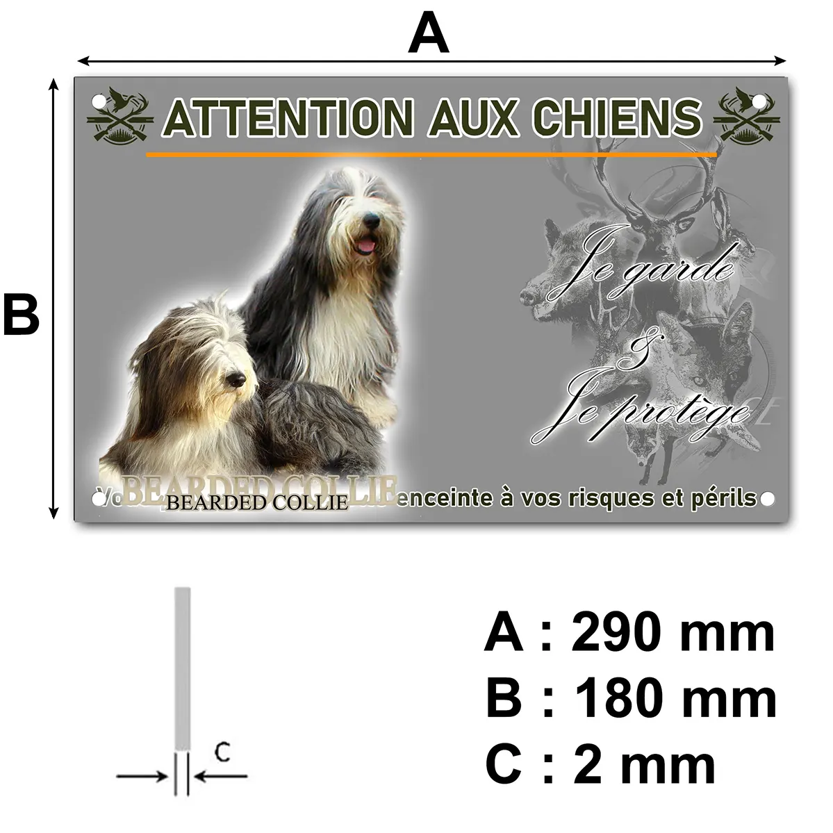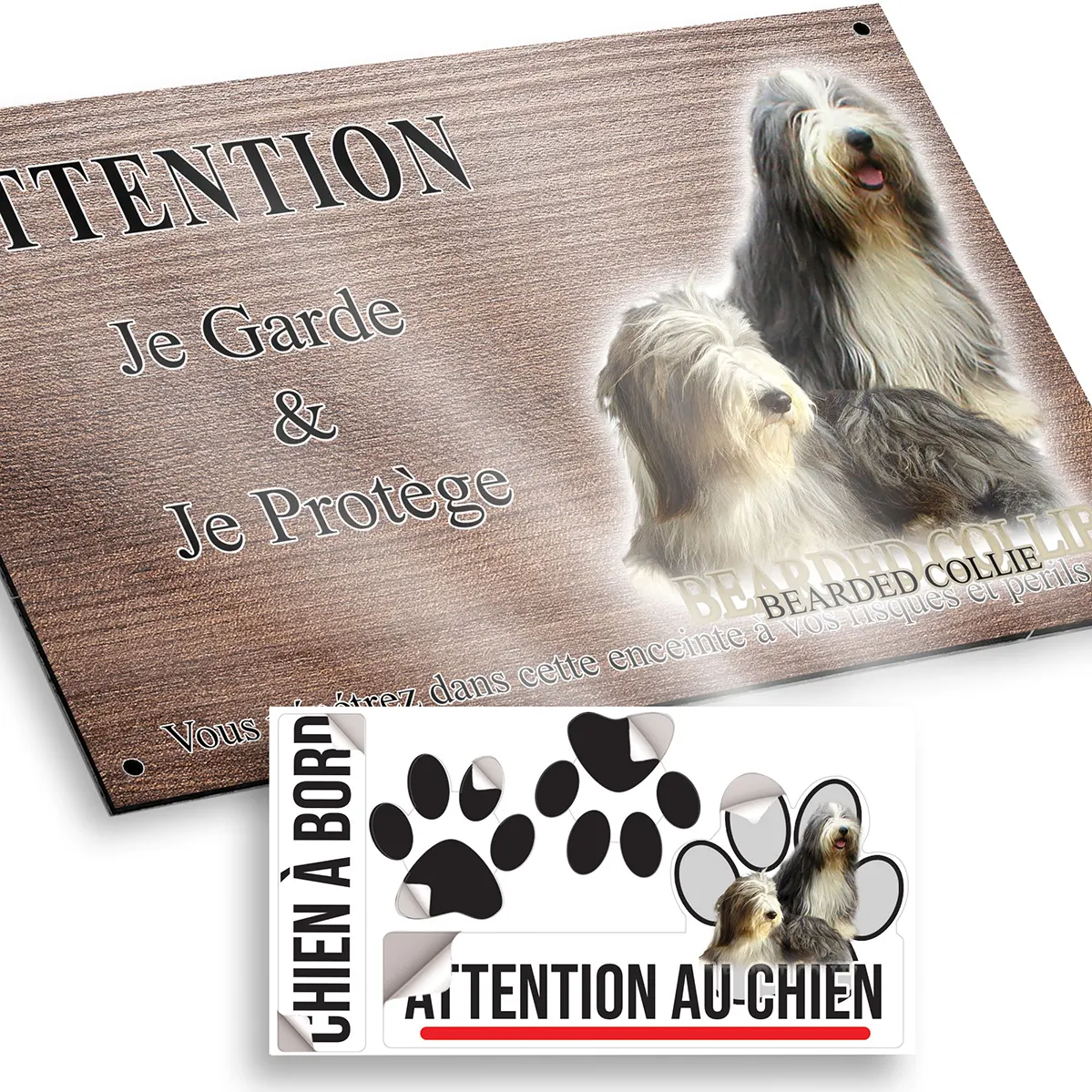 Protégez votre domicile avec style grâce à cette plaque Attention au chien colley barbu illustrée de deux majestueux Bearded Collies.