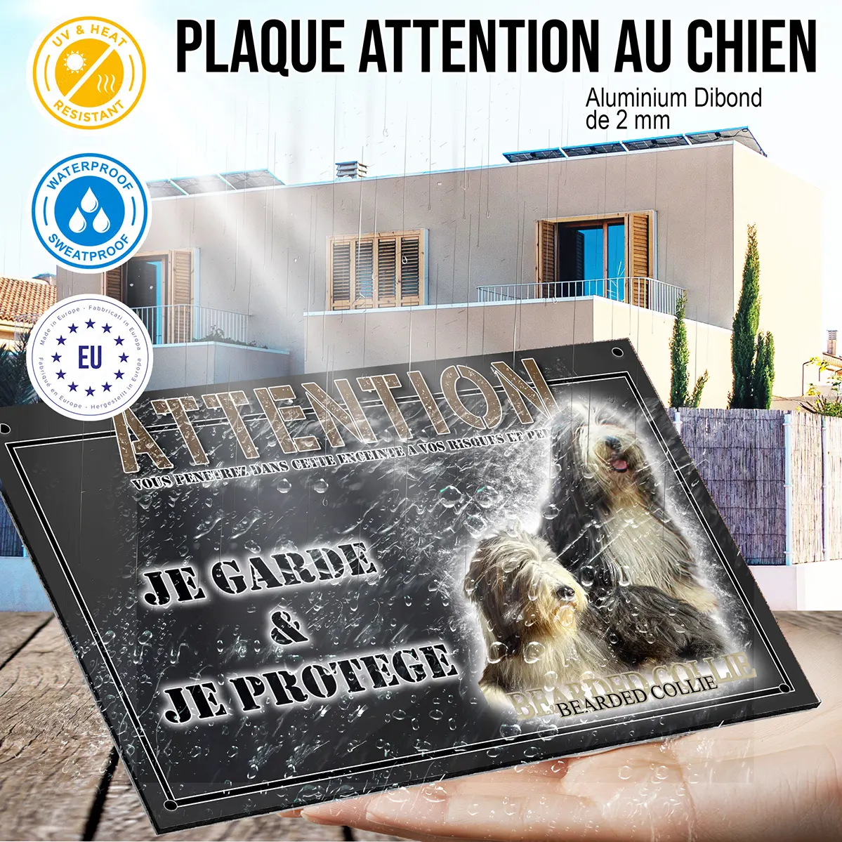 Alliant sécurité et esthétique, cette plaque Attention au chien personnalisée devient aussi un véritable élément de décoration extérieure. Son illustration travaillée attire l’œil, tout en rappelant discrètement le rôle de gardien du colley barbu. Résistante aux intempéries, elle combine praticité et raffinement, pour une protection renforcée et un accueil chaleureux de vos visiteurs.