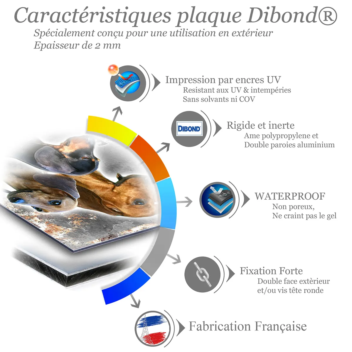 Oui, la plaque est fabriquée en aluminium Dibond de 2 mm et imprimée en UV. Elle ne craint ni la pluie, ni le soleil, ni le gel. Elle peut rester fixée dehors toute l’année sans perdre ses couleurs.