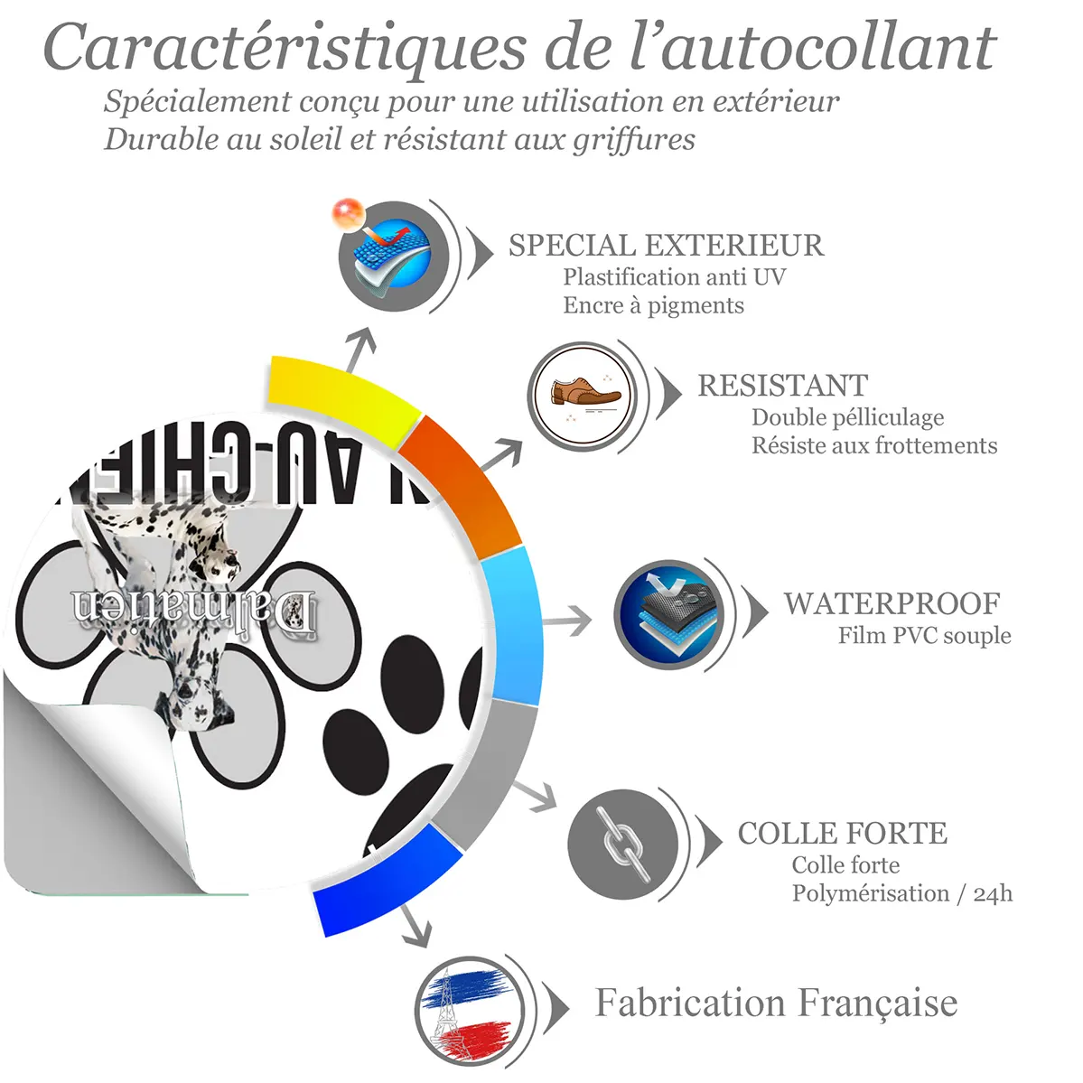Installer une plaque Attention au chien dalmatien est un choix judicieux pour renforcer la dissuasion autour de votre propriété. Même si le dalmatien est connu pour sa gentillesse, sa stature athlétique et son regard alerte suffisent souvent à refroidir les intentions malveillantes. Ce moyen de signalétique prévient poliment visiteurs, livreurs et inconnus de la présence d’un chien protecteur tout en personnalisant votre entrée avec l’image d’un chien à la robe noire et blanche si caractéristique.