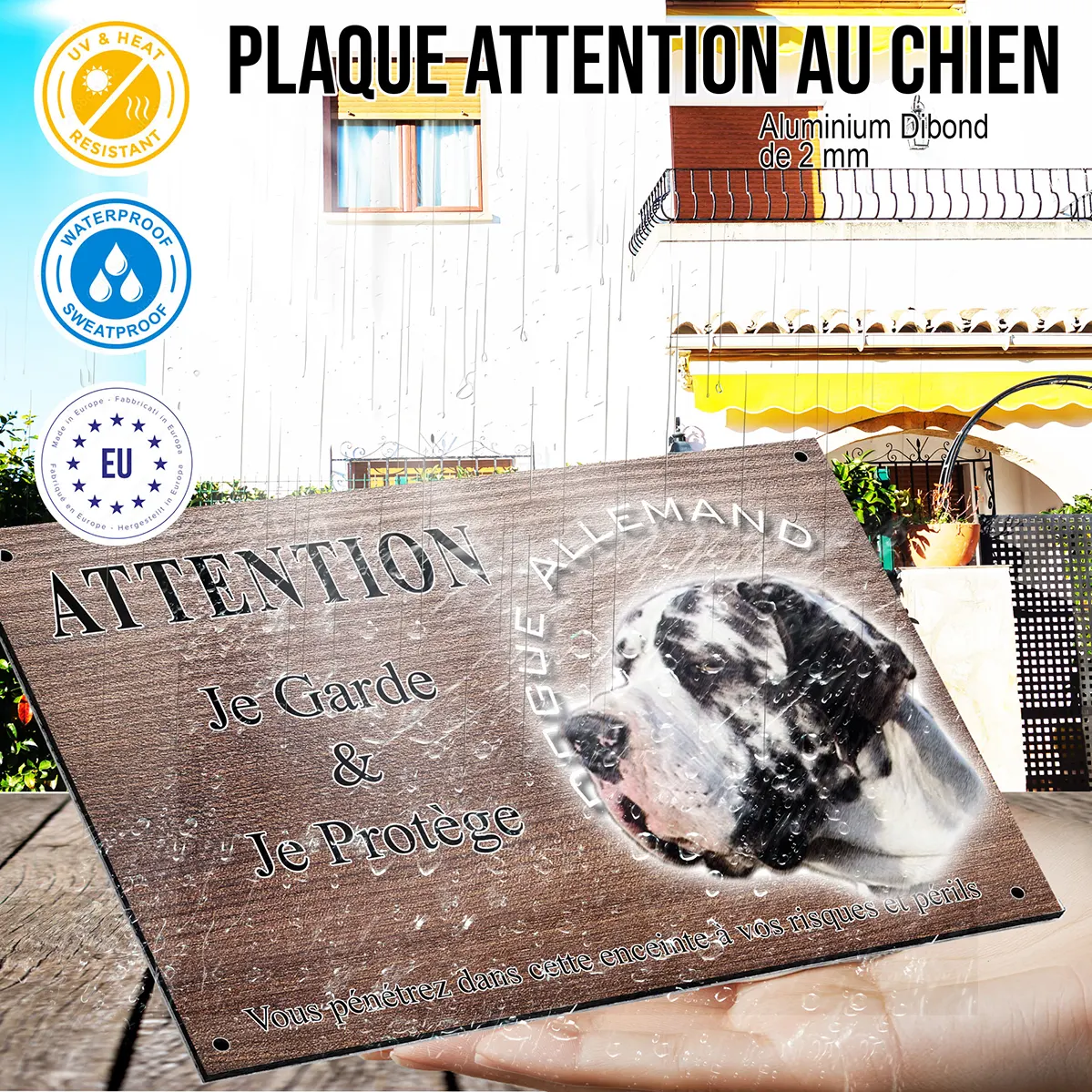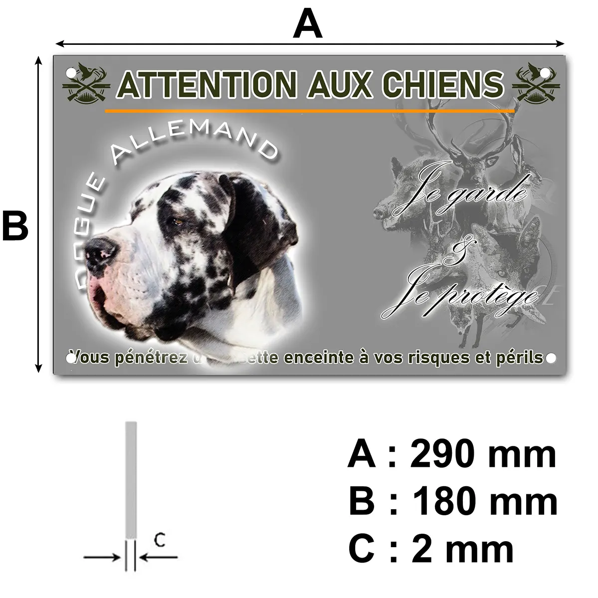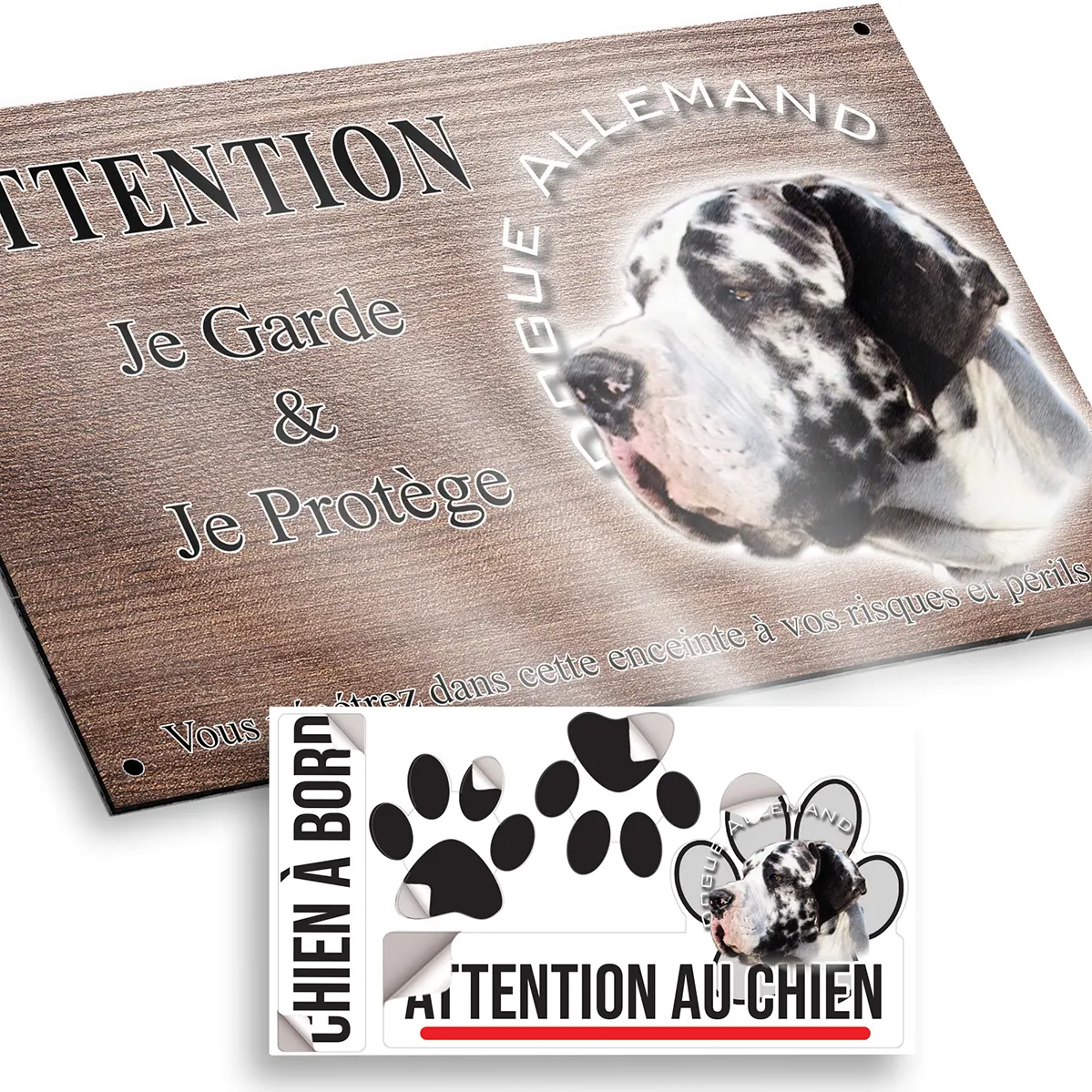 - Plaque Attention au chien dogue allemand arlequin : signalétique claire et dissuasive