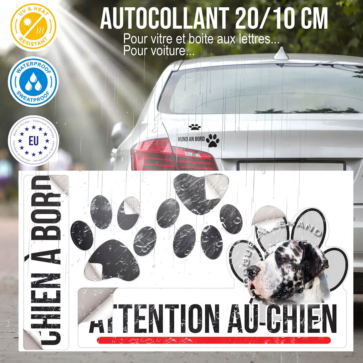 Installer une plaque Attention au chien dogue allemand arlequin à votre entrée, c’est alerter élégamment visiteurs et potentiels intrus de la présence d’un gardien vigilant. Ce type de signalétique permet de renforcer la dissuasion : face à la silhouette emblématique de ce chien, nombreux préfèreront rebrousser chemin. La personnalisation « Dogue Allemand » souligne votre soin pour la sécurité tout en rendant hommage à votre fidèle compagnon.
