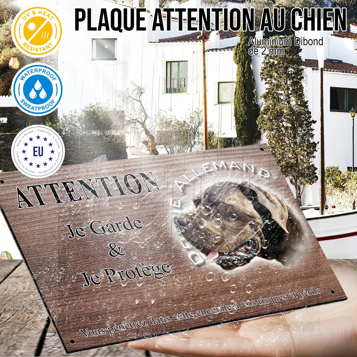 Au-delà de sa fonction préventive, la plaque Attention au chien dogue allemand bleu s’intègre aisément dans tout environnement extérieur. Avec son design soigné et son illustration raffinée, elle ajoute une touche esthétique tout en renforçant la protection de votre foyer. Offrez à votre maison une signalétique aussi élégante qu’efficace, reflet du caractère remarquable de votre compagnon.