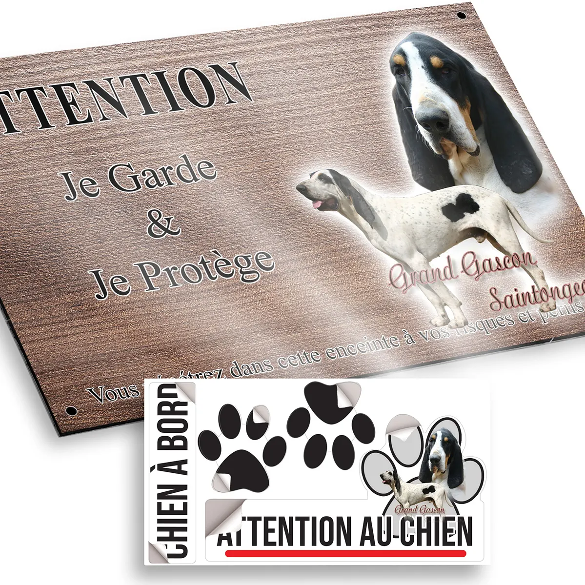 Pour en savoir plus sur notre gamme de plaque attention au chien gascon saintongeois