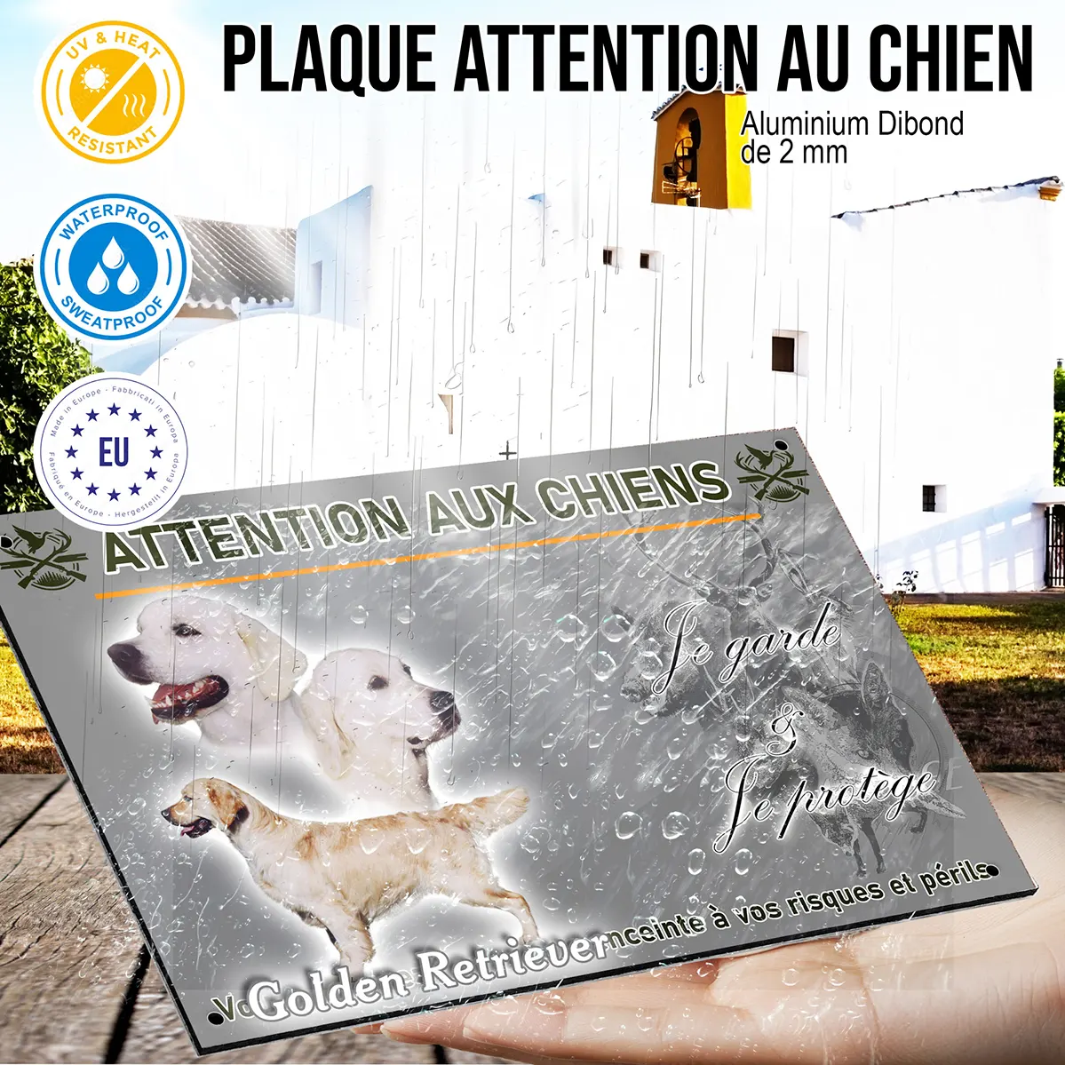 - Plaque Attention au chien golden retriever : signalétique claire et dissuasive