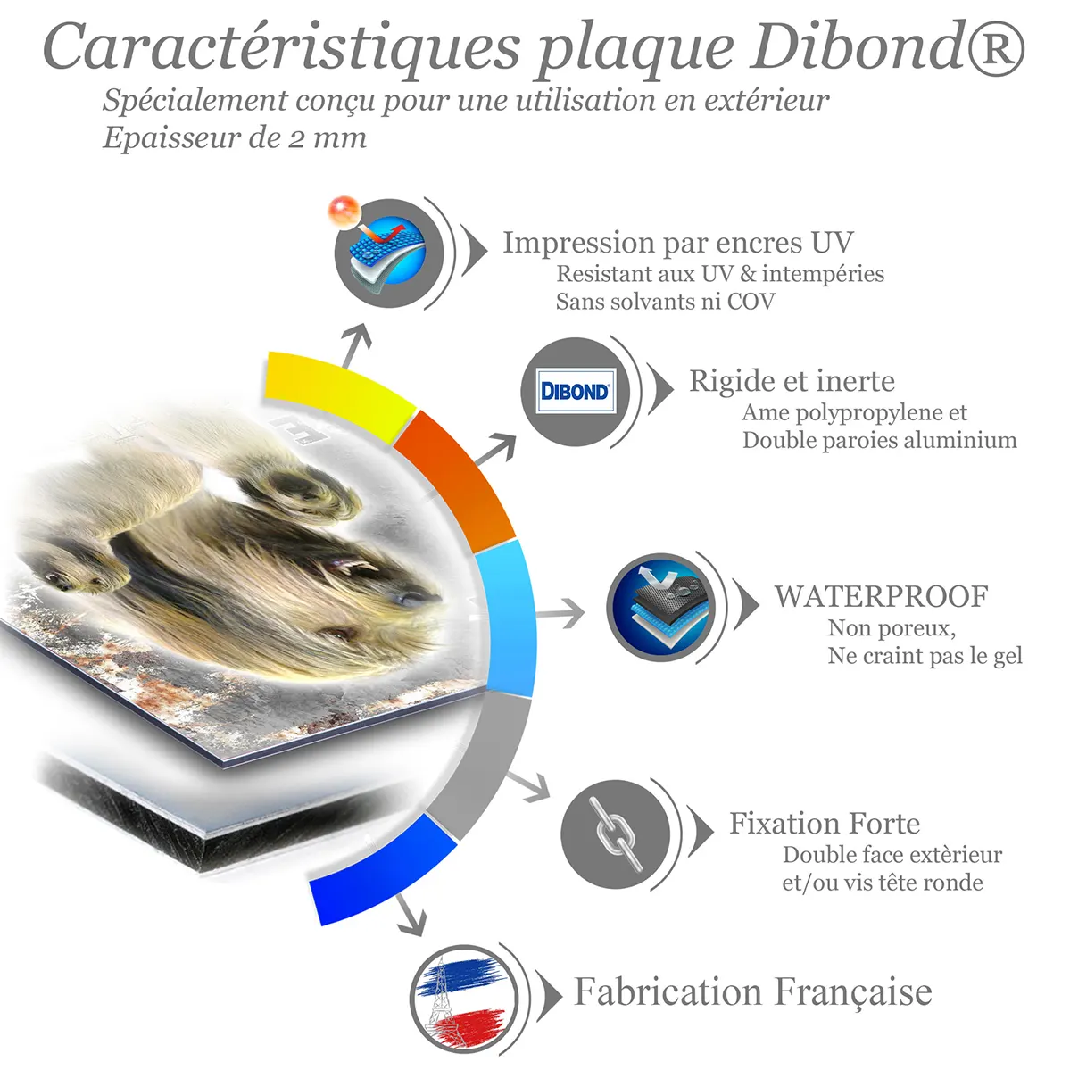 Oui, la plaque est fabriquée en aluminium Dibond de 2 mm et imprimée en UV. Elle ne craint ni la pluie, ni le soleil, ni le gel. Elle peut rester fixée dehors toute l’année sans perdre ses couleurs.