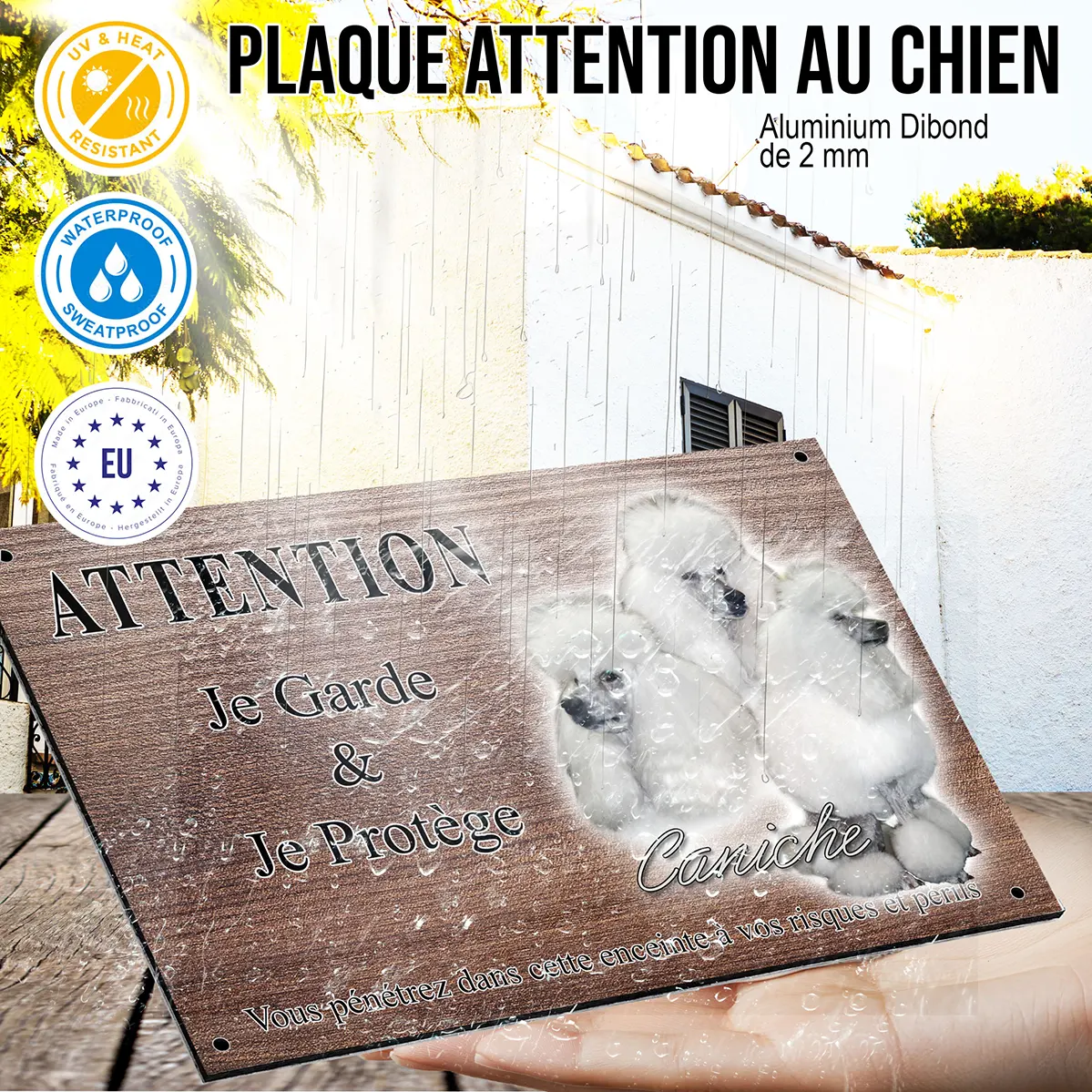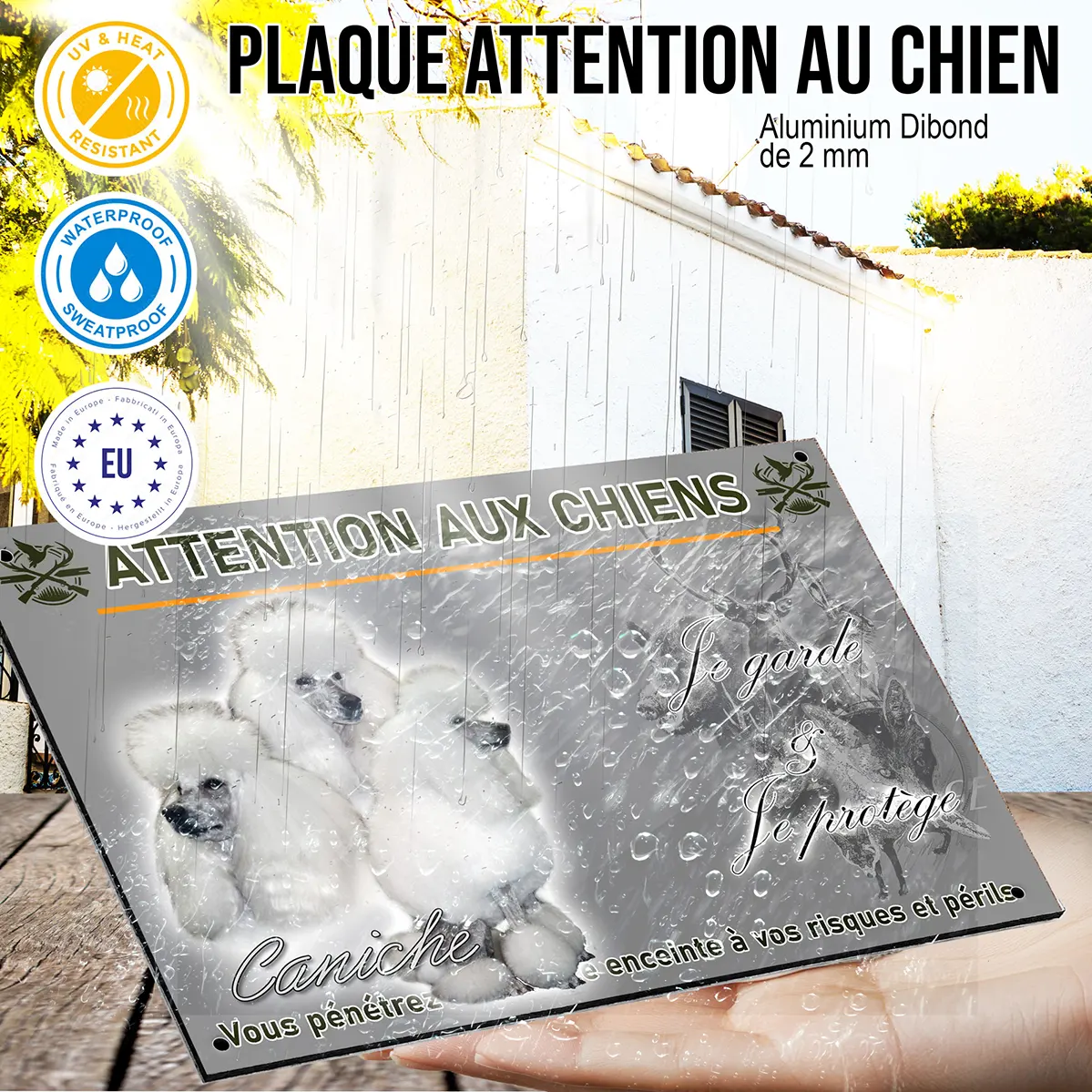 - Plaque Attention au chien grand caniche blanc : signalétique claire et dissuasive