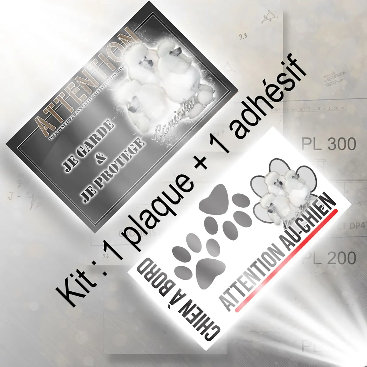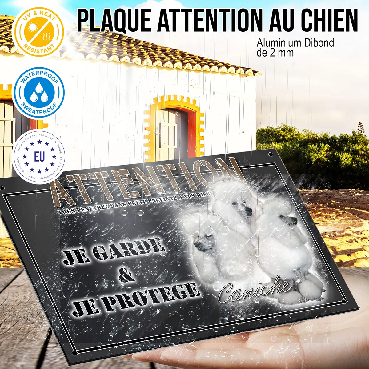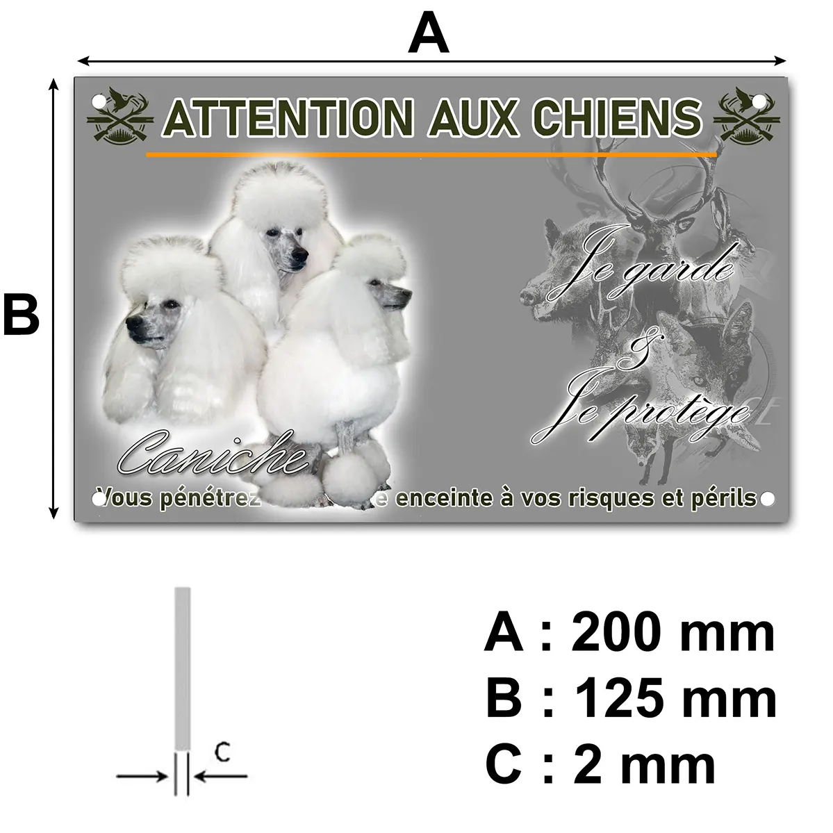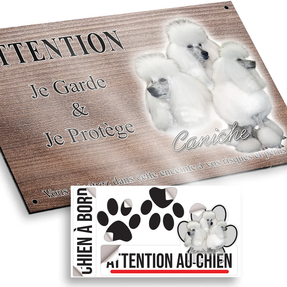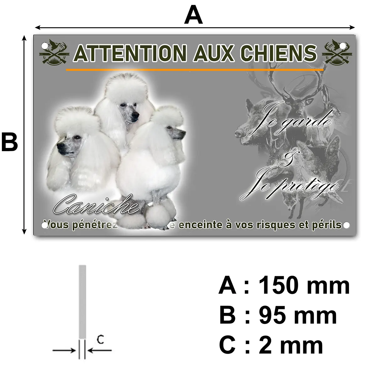Pour en savoir plus sur notre gamme de plaque attention au chien grand caniche blanc