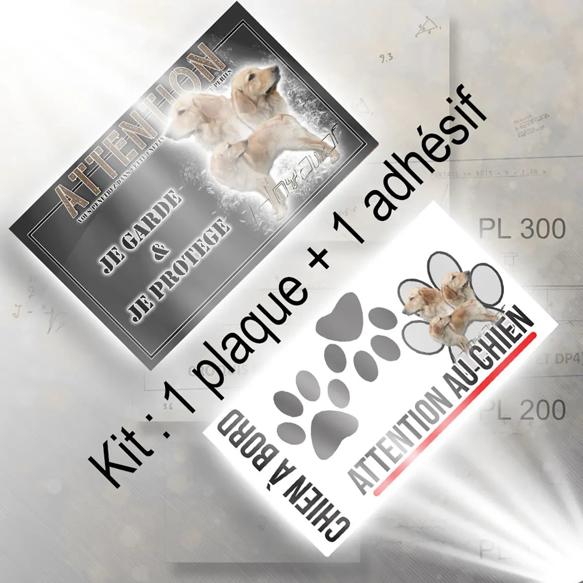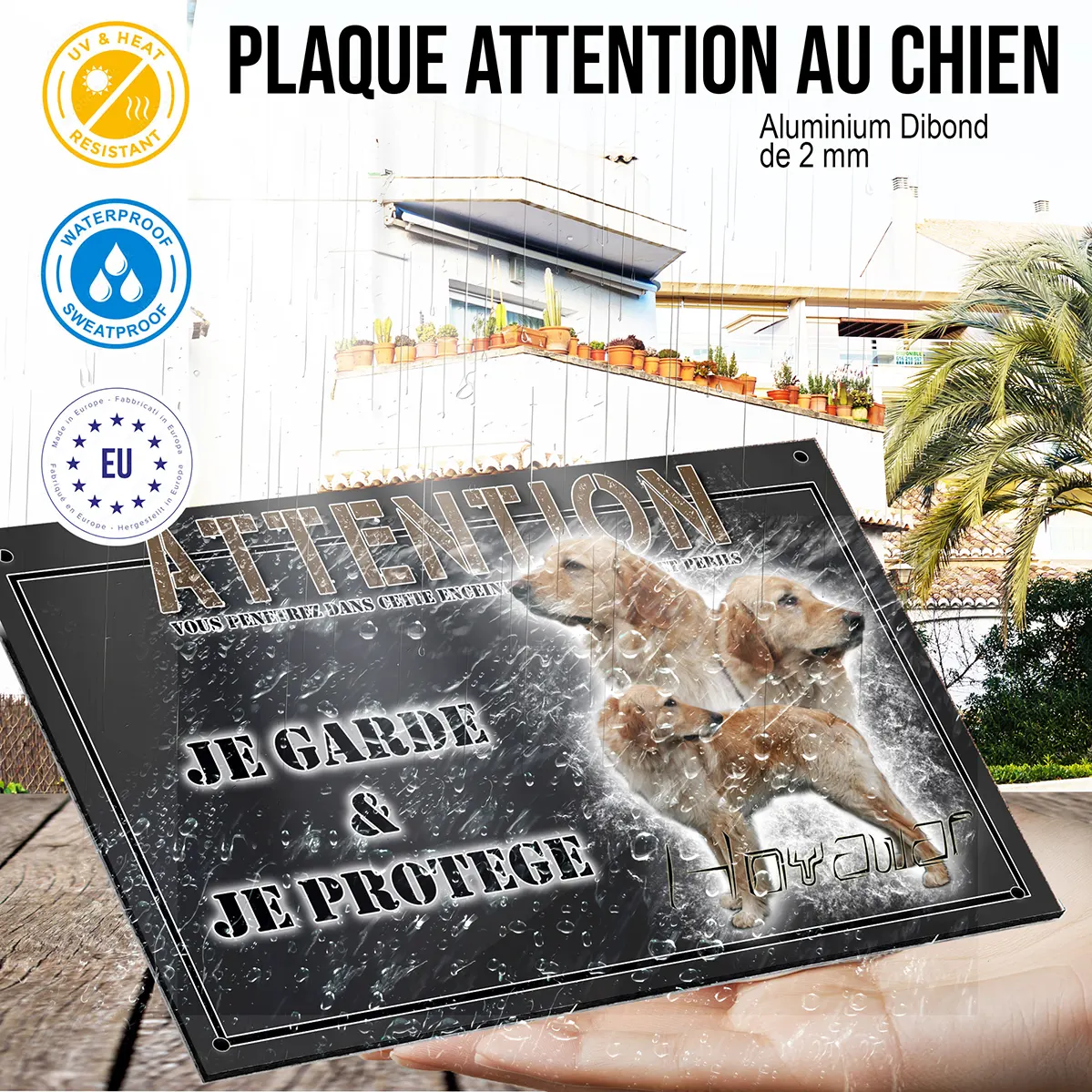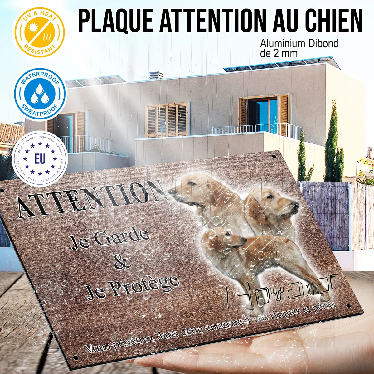 Installer une plaque Attention au chien illustrée par trois Golden Retrievers et un texte stylisé met immédiatement en évidence la présence d’un chien vigilant. Un tel visuel contribue activement à la dissuasion et prévient toute tentative d’intrusion. Cette signalétique explicite informe vos visiteurs et rassure les passants, tout en reflétant la fiabilité et la prestance de votre hovawart blond.