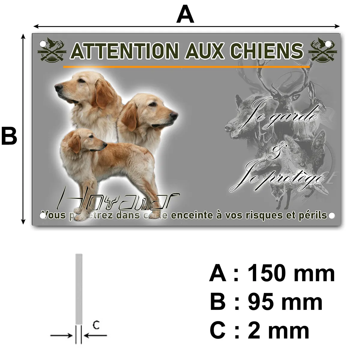 Affichez clairement la présence de votre fidèle gardien avec cette plaque Attention au chien hovawart blond, idéale pour sécuriser et personnaliser l’entrée de votre propriété. Dotée d’un design unique, cette plaque est illustrée par une image captivante présentant trois Golden Retrievers, deux en vue de profil et un debout, sur un fond coloré qui met en valeur les chiens. Un texte stylisé complète la composition, pour une touche graphique moderne et conviviale.