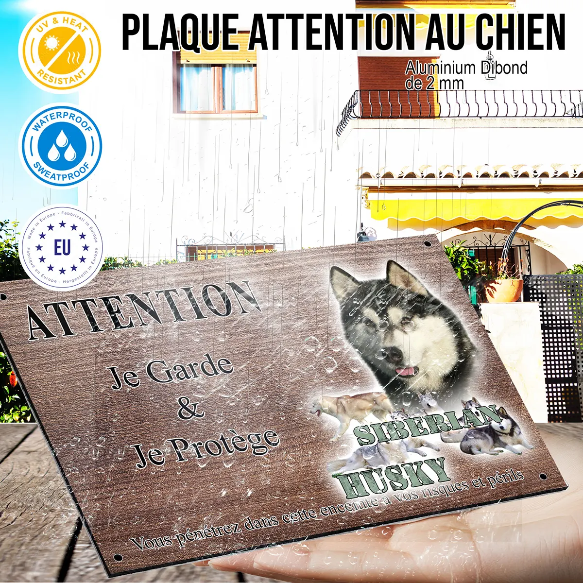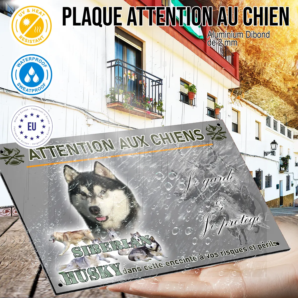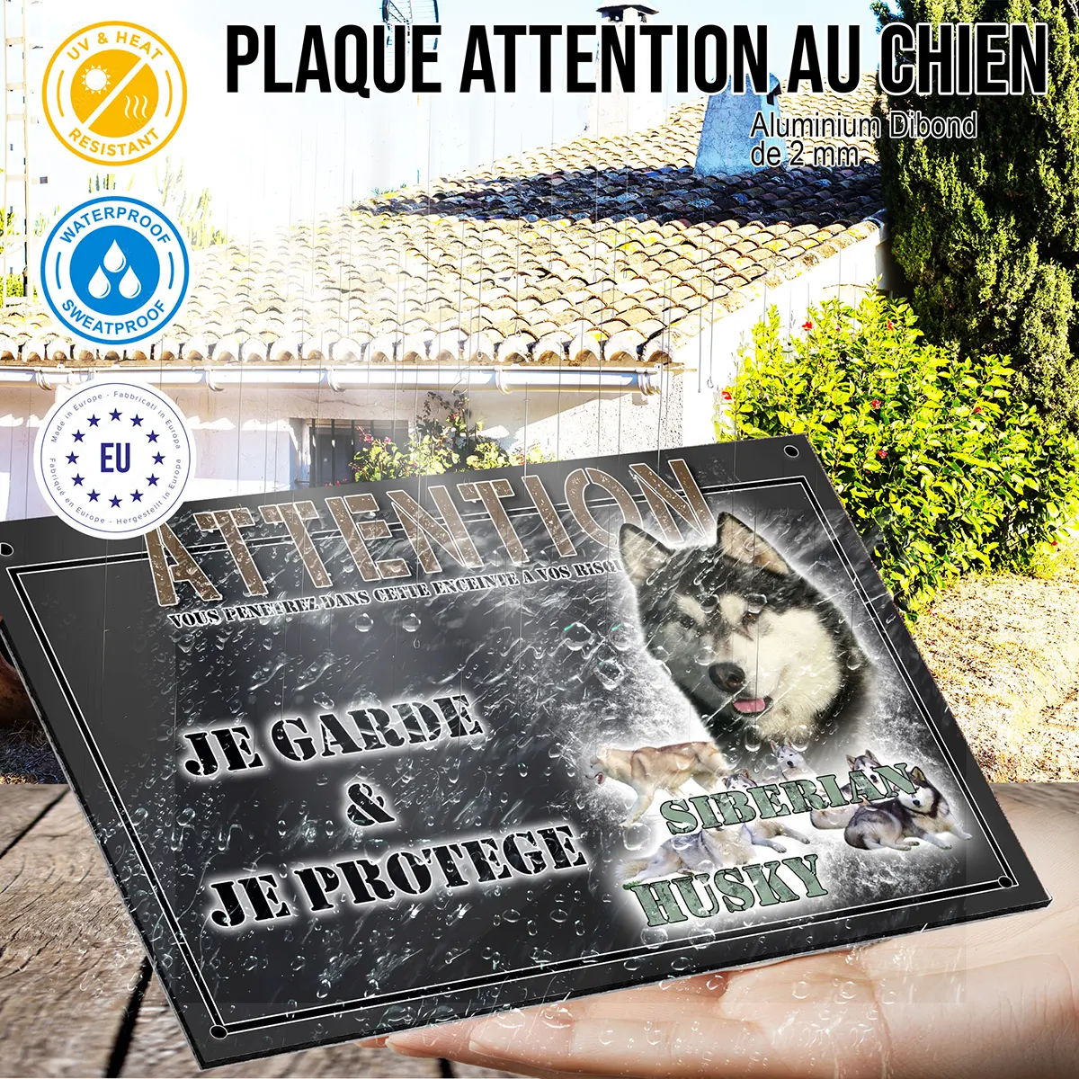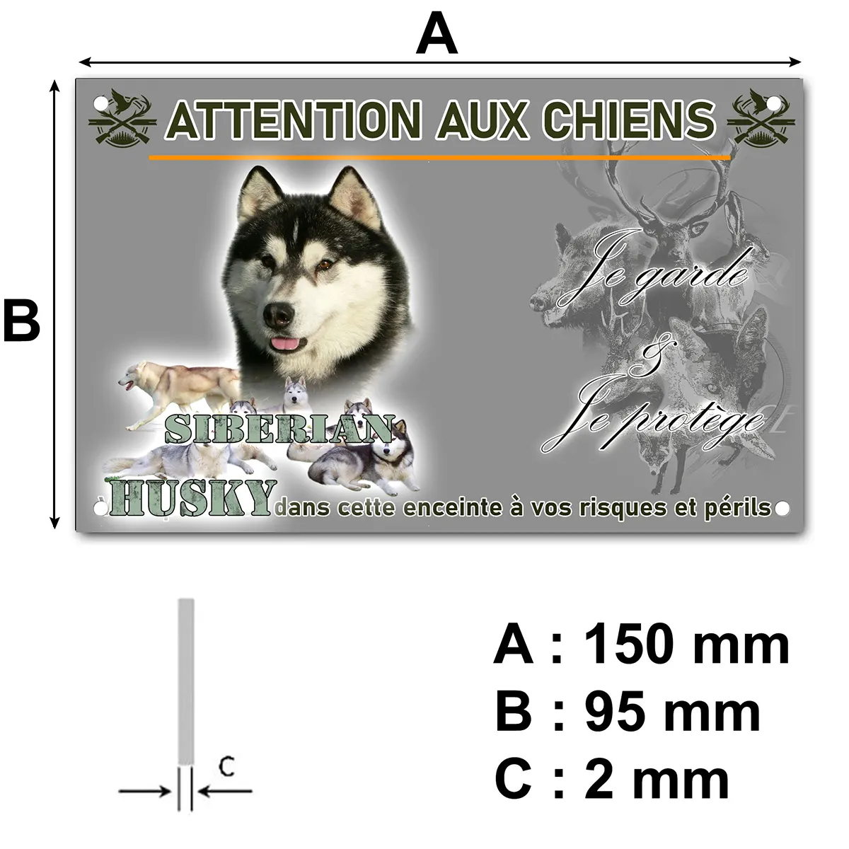 Bien plus qu’une simple plaque Attention au chien, ce modèle personnalisable à l’effigie du husky sibérien s’intègre harmonieusement à tout type de portail, clôture ou entrée de propriété. Son illustration soignée attire le regard et confère une touche d’originalité tout en remplissant efficacement son rôle de signalétique préventive. Offrez-vous la tranquillité d’esprit tout en affirmant votre amour pour ces compagnons exceptionnels grâce à une plaque à la fois décorative, robuste et efficace.
