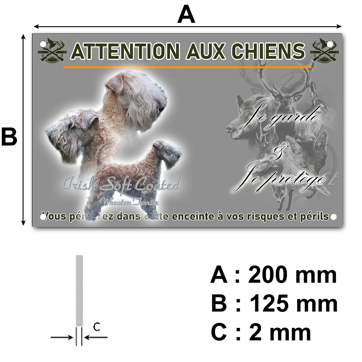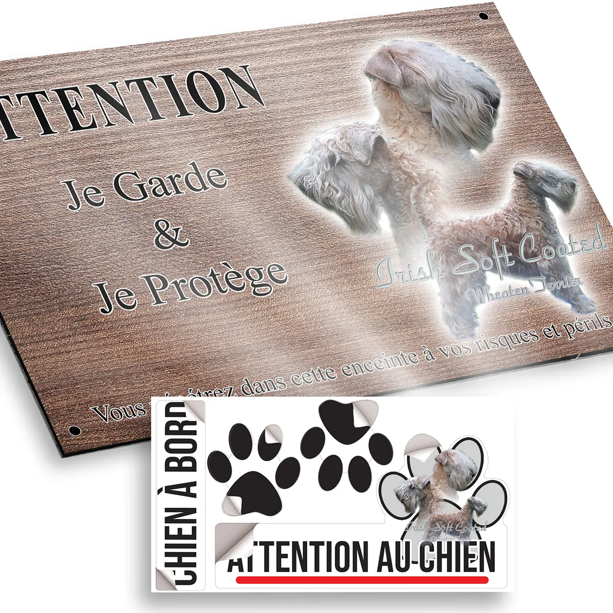 Protégez et personnalisez votre espace avec cette plaque Attention au chien unique, mettant à l’honneur le célèbre irish-soft-coated, aussi appelé Irish Soft Coated Wheaten Terrier. Ici, l’illustration raffinée présente trois chiens, révélant toute la douceur de leur pelage soyeux. Deux têtes majestueuses sont dessinées de profil sur la droite, accompagnées d’un irish-soft-coated en position d’alerte tourné vers l’avant. Le tout est mis en valeur sur un magnifique fond flou aux nuances de vert, qui souligne l’élégance naturelle de la race.