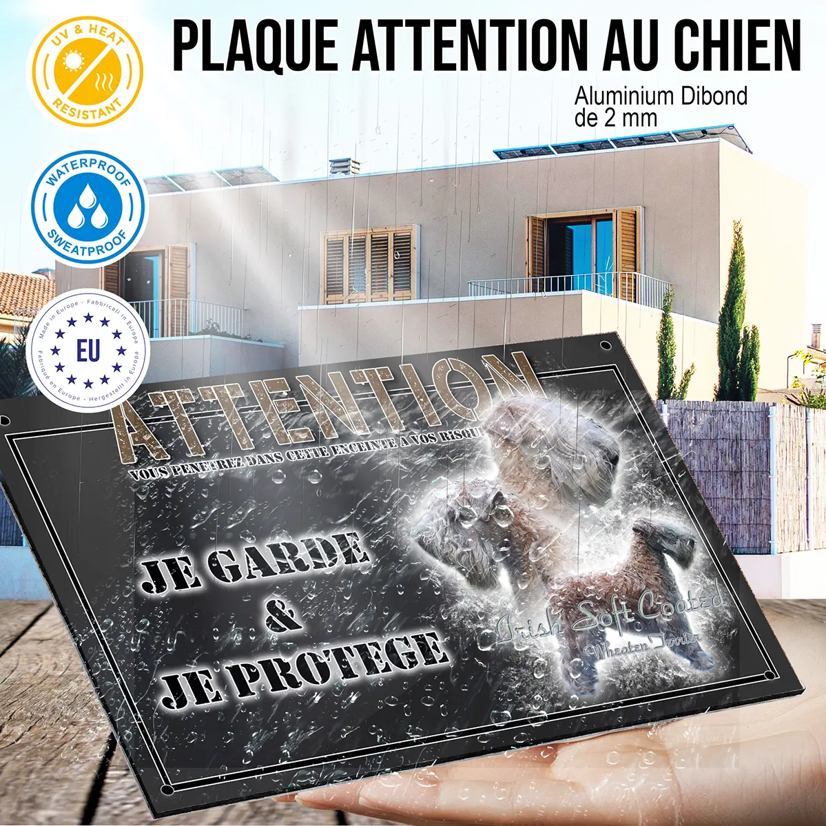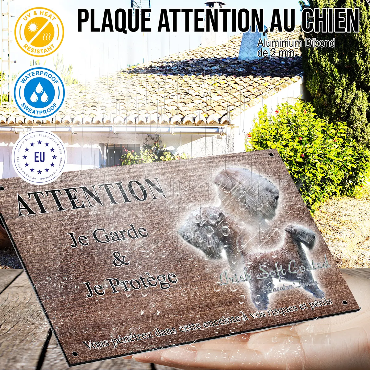 Cette plaque Attention au chien n’est pas qu’un simple panneau de signalisation : c’est aussi un élément décoratif qui rehaussera votre entrée ou votre portail. Sa qualité d’impression, la finesse de ses illustrations et son design moderne vous offrent un accessoire durable, mêlant sécurité et esthétique. Affirmez votre amour pour les Irish Soft Coated Wheaten Terriers avec une touche de style et de protection supplémentaire.