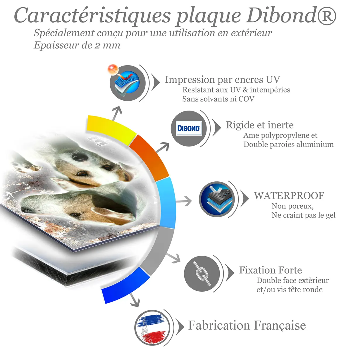 Oui, la plaque est fabriquée en aluminium Dibond de 2 mm et imprimée en UV. Elle ne craint ni la pluie, ni le soleil, ni le gel. Elle peut rester fixée dehors toute l’année sans perdre ses couleurs.
