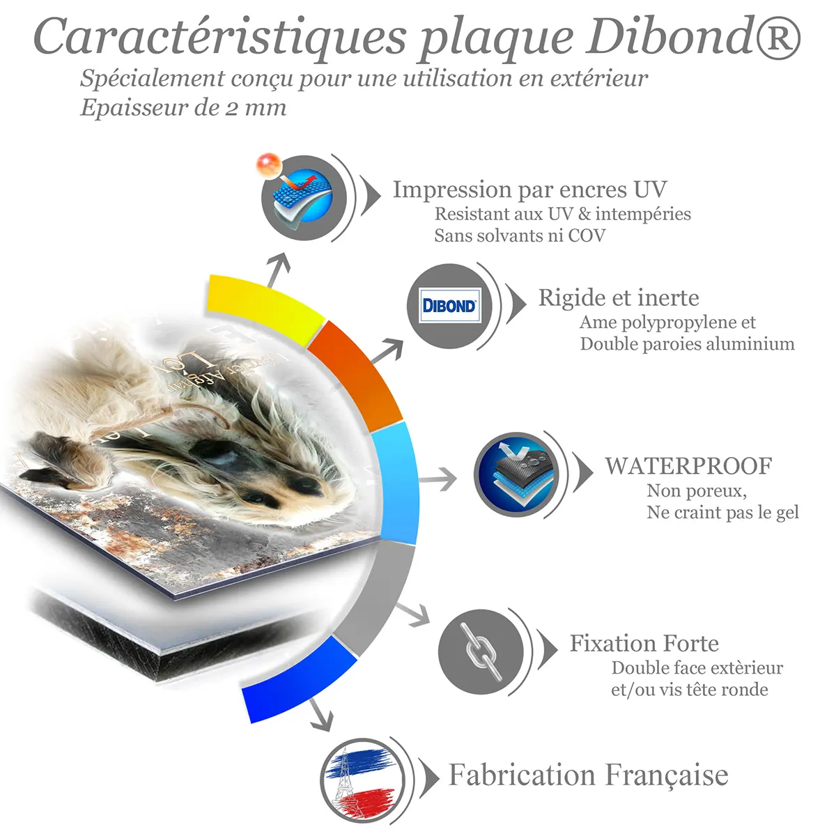 Oui, la plaque est fabriquée en aluminium Dibond de 2 mm et imprimée en UV. Elle ne craint ni la pluie, ni le soleil, ni le gel. Elle peut rester fixée dehors toute l’année sans perdre ses couleurs.