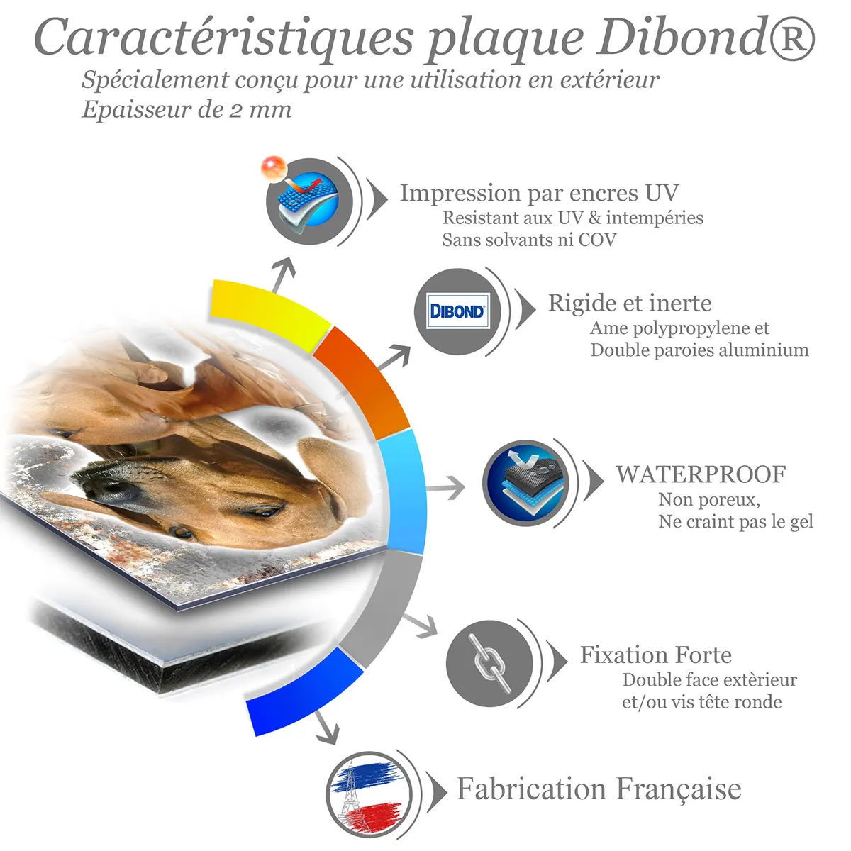 Oui, la plaque est fabriquée en aluminium Dibond de 2 mm et imprimée en UV. Elle ne craint ni la pluie, ni le soleil, ni le gel. Elle peut rester fixée dehors toute l’année sans perdre ses couleurs.