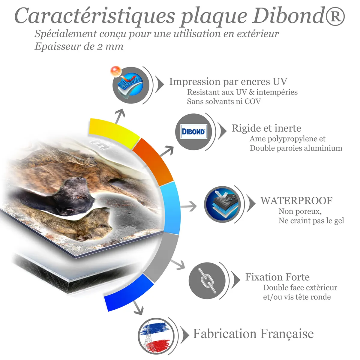 Oui, la plaque est fabriquée en aluminium Dibond de 2 mm et imprimée en UV. Elle ne craint ni la pluie, ni le soleil, ni le gel. Elle peut rester fixée dehors toute l’année sans perdre ses couleurs.
